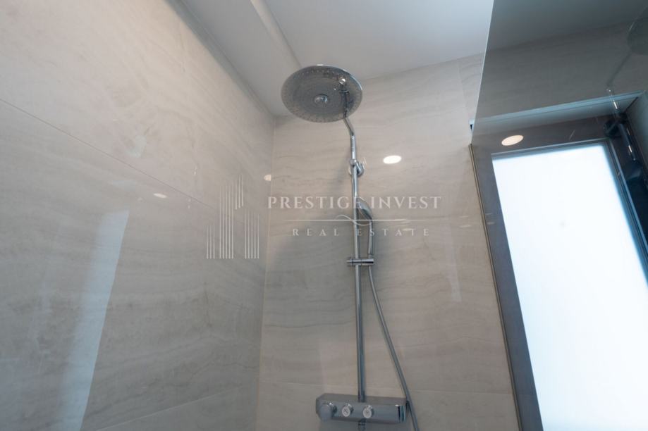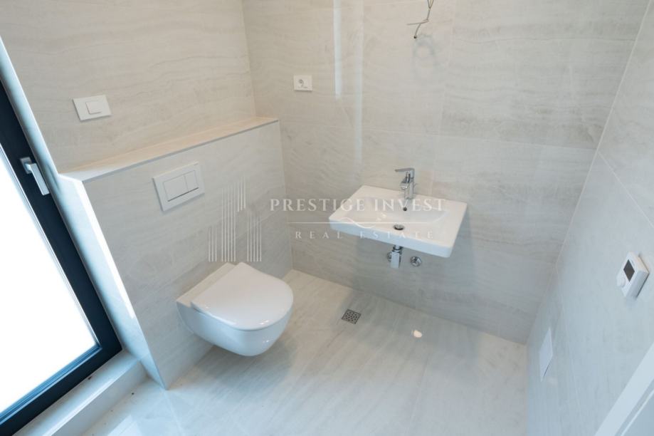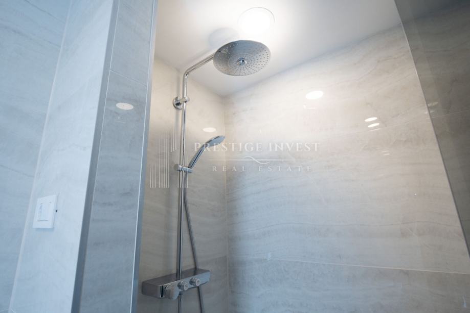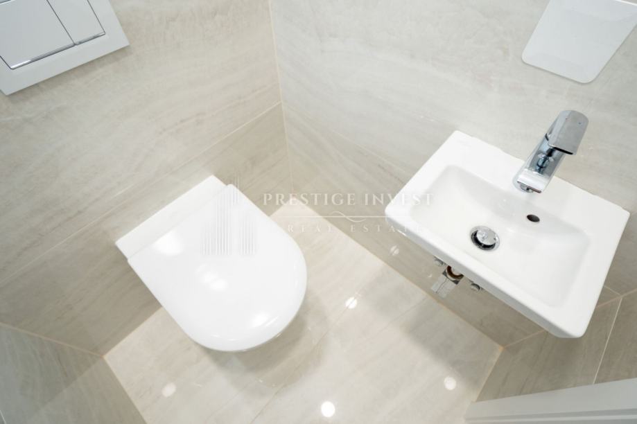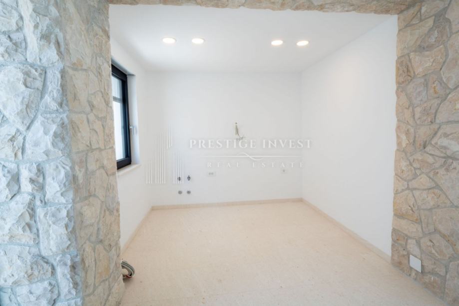 Kuhinjski kutak je projektiran za kuhinjski otok, tako da su već pripremljeni priključci za toplu i hladnu vodu, kanalizaciju i struju za kuhanje . U blizini dnevnog boravka nalazi se wc s umivaonikom, a svaka spavaća soba ima svoju kupaonicu. Odabrane pločice ponovno su visoke kvalitete talijanskog proizvođača Panaria, sanitarna keramika njemačkog brenda Villeroy & Boch . Žuti benkovački kamen korišten je u kuhinji i dnevnom boravku. Vanjski prostori, a posebno terase obložene su bijelim, kvalitetnim bračkim kamenom. Zanimljivo je da je isti kamen korišten za oblaganje Bijele kuće u Washingtonu.
