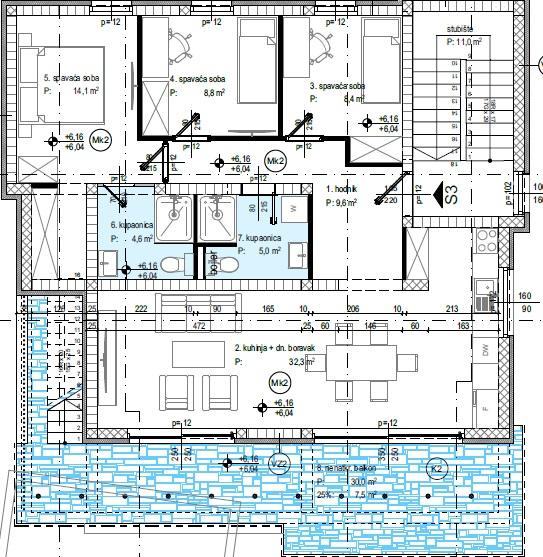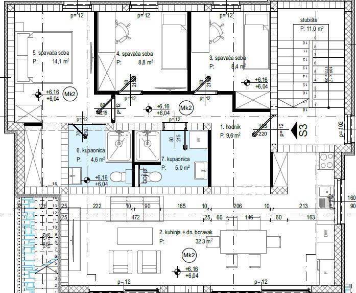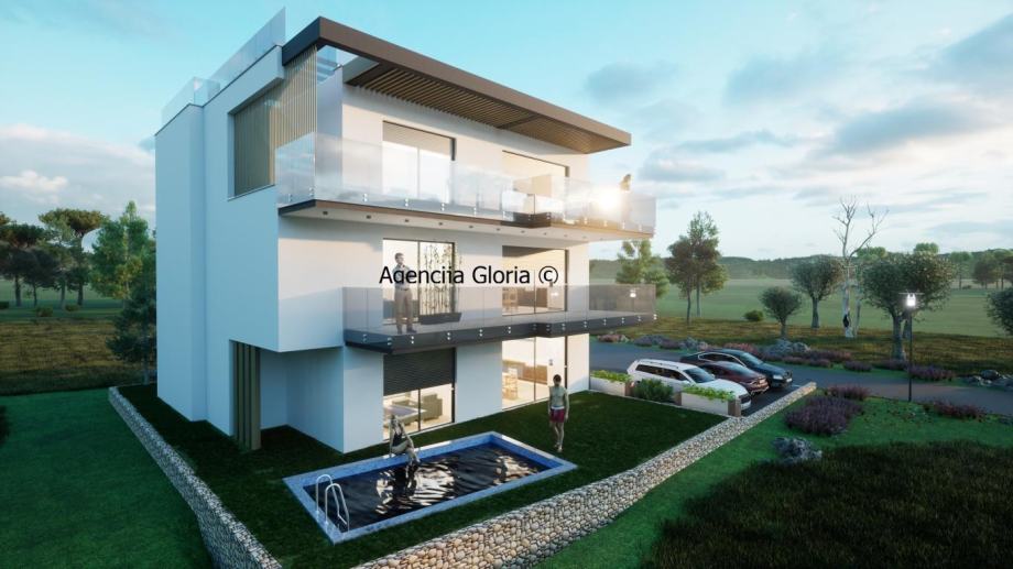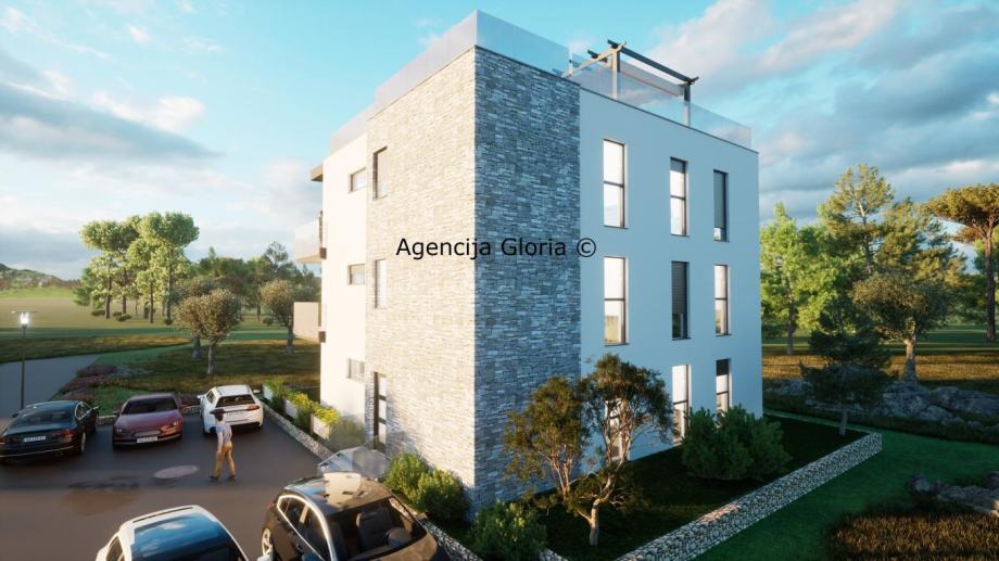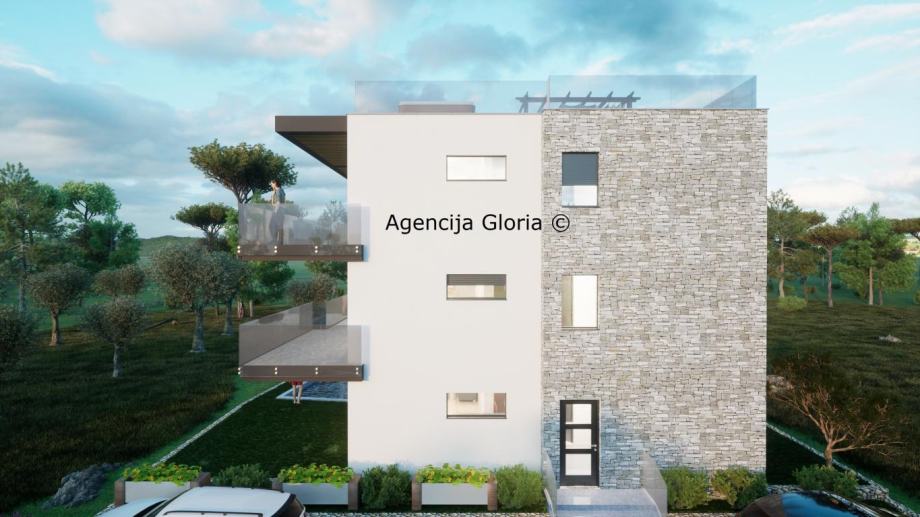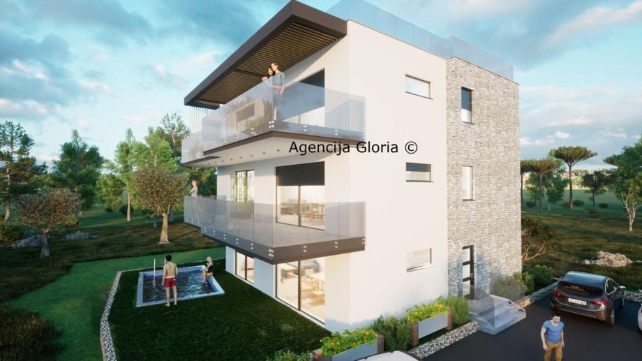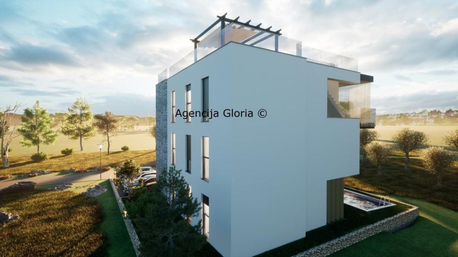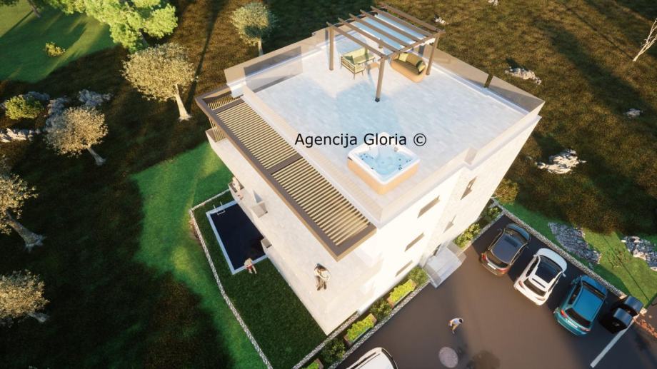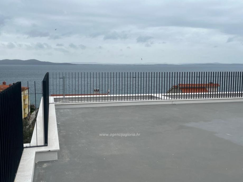 EKSKLUZIVNO! Prodaju se luksuzni i modreno uređeni apartmani u mirnom dijelu mjesta Kožino kod Zadra u novogradnji 95m do mora. Smješteni su u manjoj stambenoj zgradi sa tri stambene jedinice koja se sastoji od tri etaže: prizemlje, prvi i drugi kat. Svakom apartmanu pripadaju dva parkirna mjesta i spremište u podrumu zgrade. Svaki apartman se proteže preko cijele etaže. Proces izgradnje karakterizira upotreba visokokvalitetnih materijala koji kupcima/korisnicima pružaju maksimalnu udobnost i privatnost. U apartmane se ugrađuju vrhunski materijali: visokokvalitetna stolarija sa roletama na struju; visokokvalitetna keramika u cijelome stanu; podno grijanje; klimatizacija u svim prostorijama; toplinska fasada; dijelovi pročelja objekta oblažu se kamenom. Planirani rok završetka gradnje je 30.06.2024. godine. Prodaje se Stan oznake S3-drugi kat: Apartman prodajne površine 124,58m2 smješten na drugom katu stambene zgrade. Sastoji se od: hodnika površine 9,57m2, kuhinje+blagovaonice+dnevnog boravka površine 32,35m2, spavaće sobe površine 8,4m2, spavaće sobe površine 8,76m2, spavaće sobe površine 14,13m2, kupaonice površine 4,63m2, kupaonice površine 5,02m2 te nenatkrivenog balkona neto površine 7,51m2. Površina stambenog dijela apartmana iznosi 90,37m2. Pripada mu krovna terasa površine 101,23m2, spremište površine 6,8m2 i dva vanjska parkirna mjesta. Kožino je malo turističko i ribarsko mjesto smješteno na svega 7km sjeverozapadno od Zadra s velikim brojem modernih villa i apartmana u prirodnom okruženju. Poznato je po prekrasnom zalasku sunca i atraktivnim plažama s čistim morem u okruženju mediteranske vegetacije. Idealno za obiteljski ali i aktivni odmor.