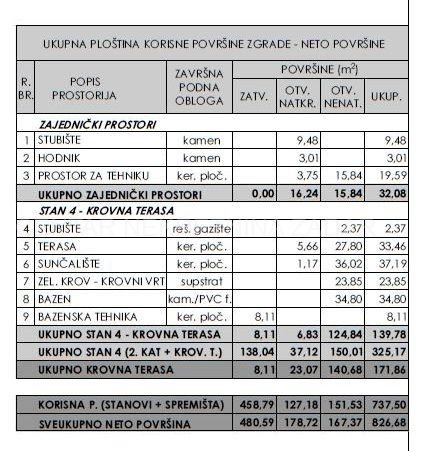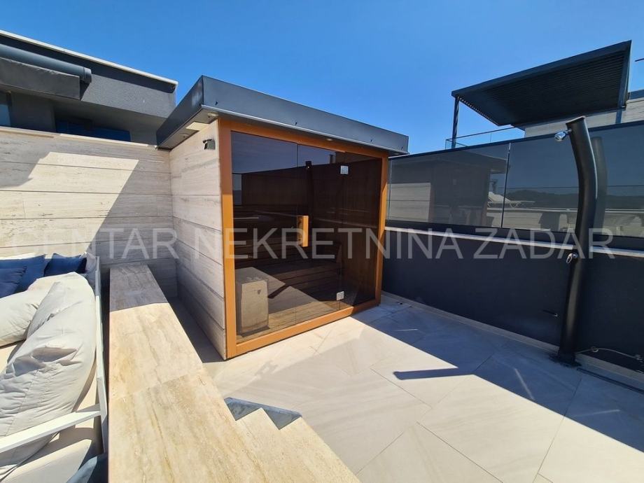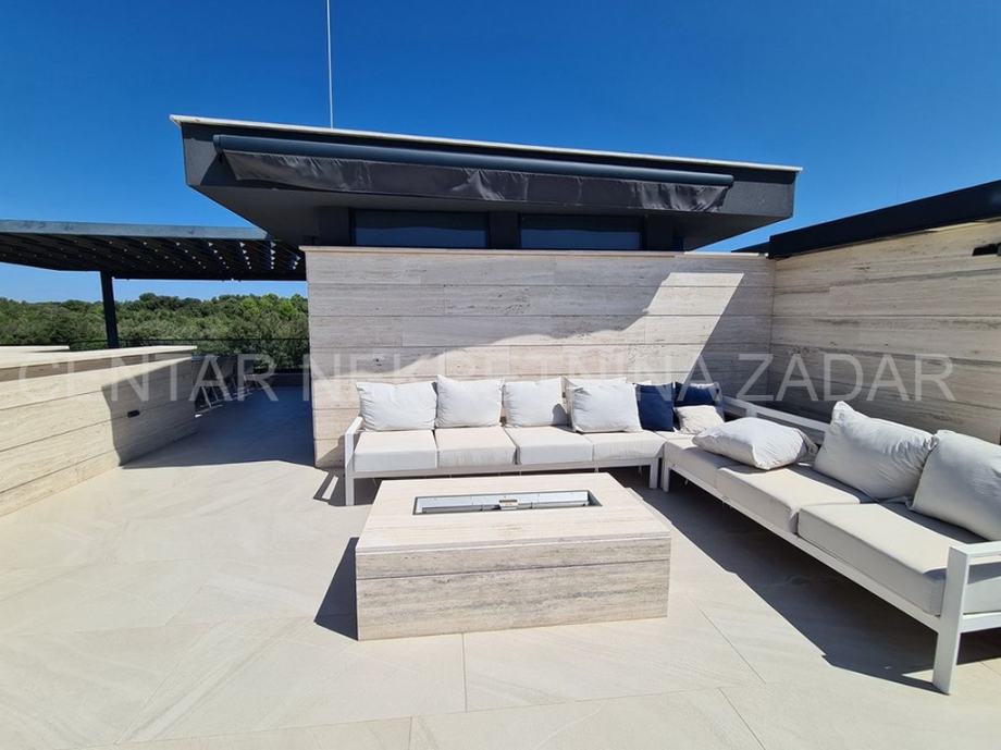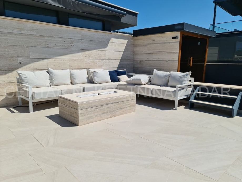 Posebnost stana je velika krovna terasa na koju se može pristupiti spiralnim stepenicama s terase stana ili preko stubišta zgrade. Terasa je potpuno opremljena za ugodan boravak više osoba koji iz svakog dijela mogu uživati u panoramskom pogledu na more i otoke. Na terasi su grijani bazen od oko 33 m² sa sunčalištem, sauna, jacuzzi, tuš te velika garnitura za sjedenje. Na dijelu natkrivenom pergolom nalazi se stol za objedovanje i vanjska kuhinja. Ukupna tlocrtna površina stana zajedno s krovnom terasom i pripatcima iznosi 327,17 m².