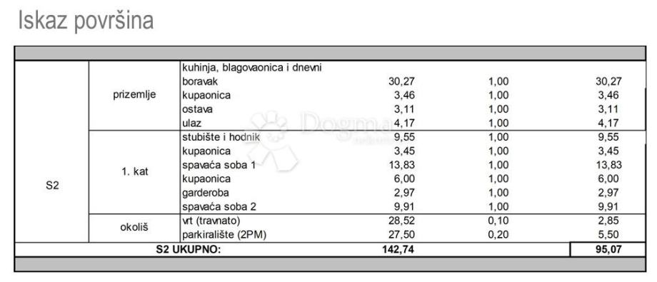 Ukupna brutto kvadratura stana i pripadaka iznosi 142,74m2, odnosno 95,07m2 netto prodajne površine.