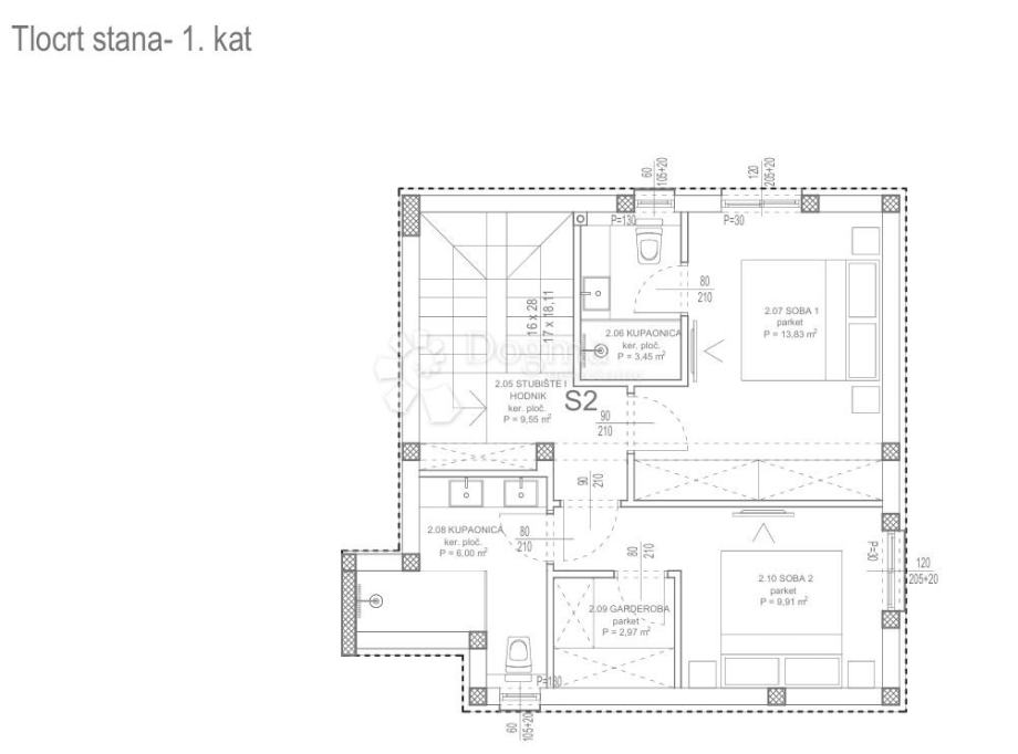 Stan S2 je dvoetažni stan. Prizemlje se sastoji od ulaznog prostora, kuhinje, blagovaonice, dnevnog boravaka, toaleta i ostave.