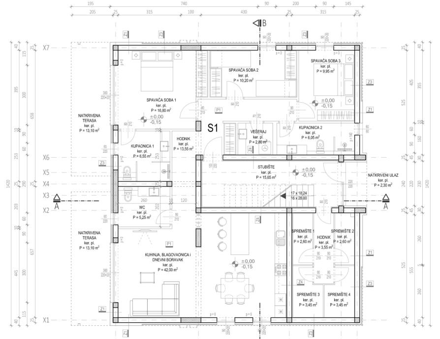 Stan S1 - prizemlje - stambena neto površina 113,15 (3 spavaće sobe + 2 kupaonice) + 2 natkrivene terase + nenatkrivena terasa + vanjski bazen (30 m2) + vrt (109,46 m2 x 0,1 = 10,95 m2) + ostava3 (3,45 m2) + 2 parking mjesta, ukupno neto obračunska površina 159,20 m2 = 668.640 EUR