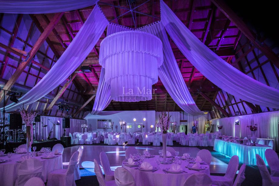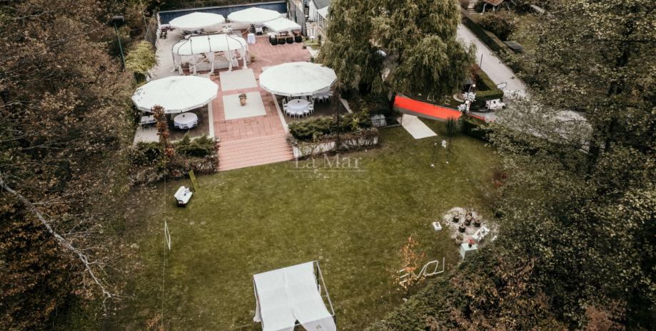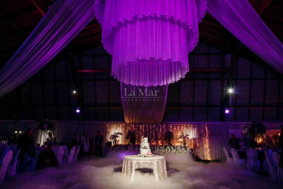 Elegantna raskošna dvorana na 600m2, potpuno uređena sa svim asortimanom , opremljena kuhinja, prijemne terase, zasebna drvena kućica za mladence, odvojeni restoran koji se može voditi neovisno o svadbenim eventima, vlastiti parking za goste, kapelica...
