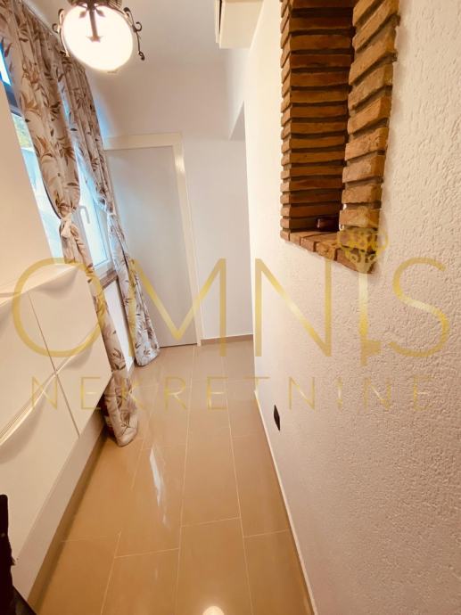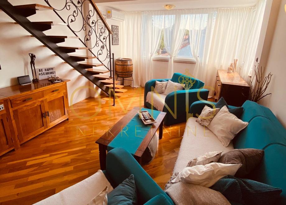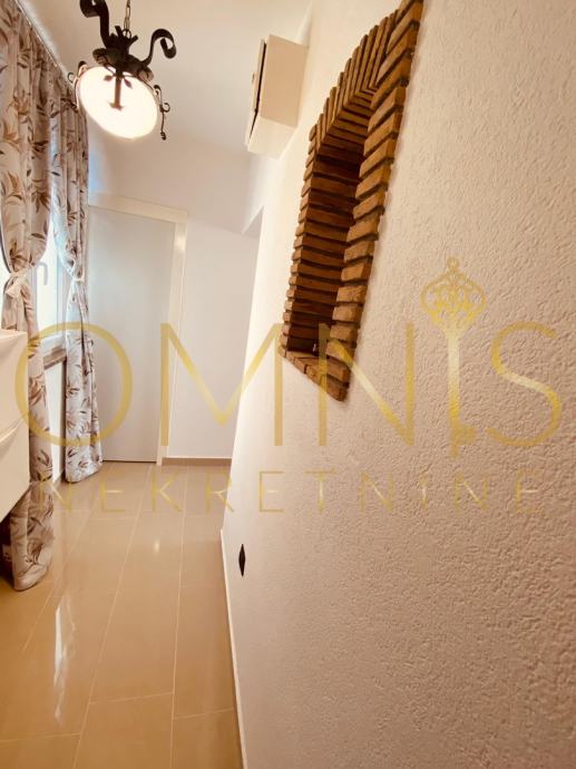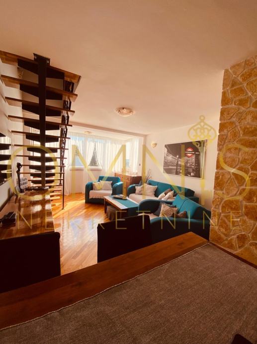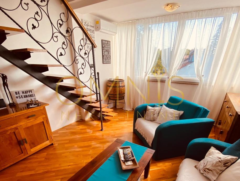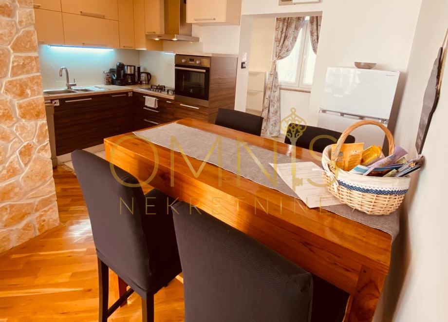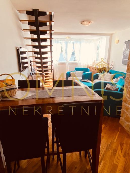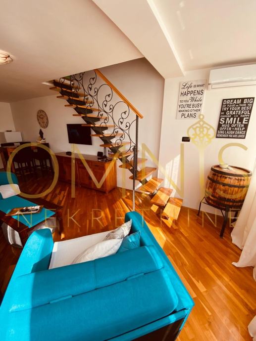 Prodajemo prekrasno uređen apartman u stambenoj zgradi. Sastoji se od dvije etaže. Na prvoj etaži se nalaze zatvoreni balkon, prostrani dnevni boravak, kuhinja, hodnik te kupaonica s wc-om. Na drugoj etaži se nalazi prostrana spavaće soba. Grijanje i hlađenje u stanu je na inverter klima uređaj. Iz stana se pruža prekrasan pogled na more. Ispred zgrade ima dovoljno mjesta za parking. Stan je komletno uređen i namješten te se kao takav i prodaje. Također je stan kategoriziran tako da budući kupac po želji može preuzeti uhodani posao. Odlična nekretnina svega 3 minute pješice od plaže.