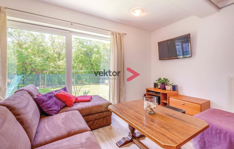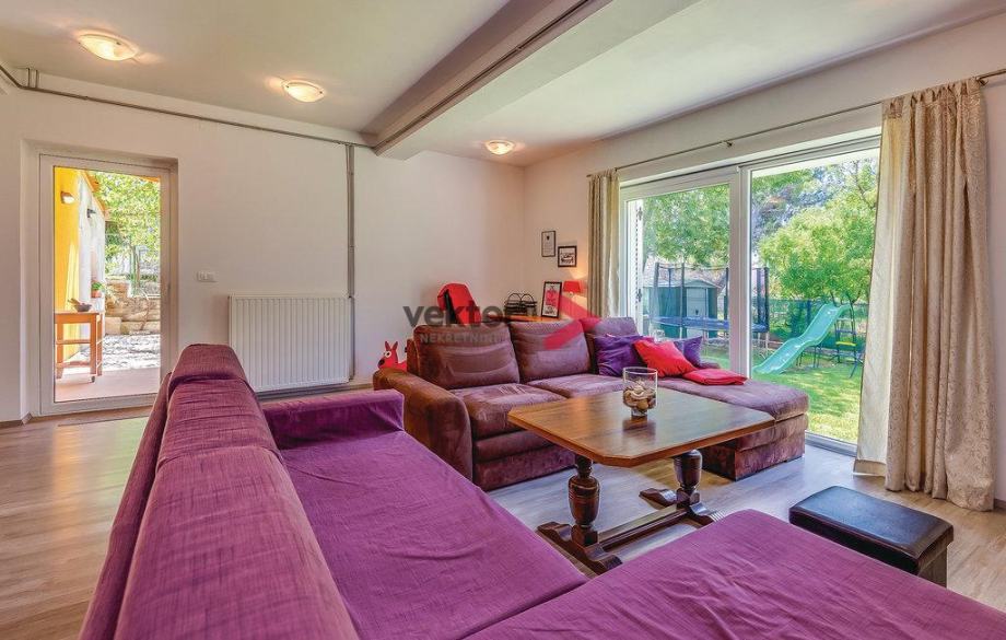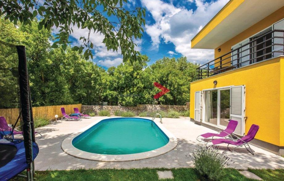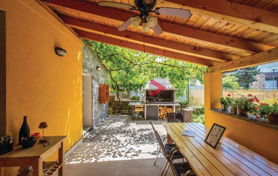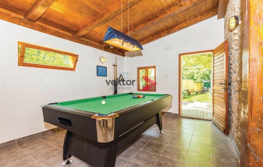 Na uređenoj okućnici nalazi se bazen i terasa za sunčanje, te lijepa zelena površina. Uz kuću smješten je i prostor za zabavu sa malim toaletom.
