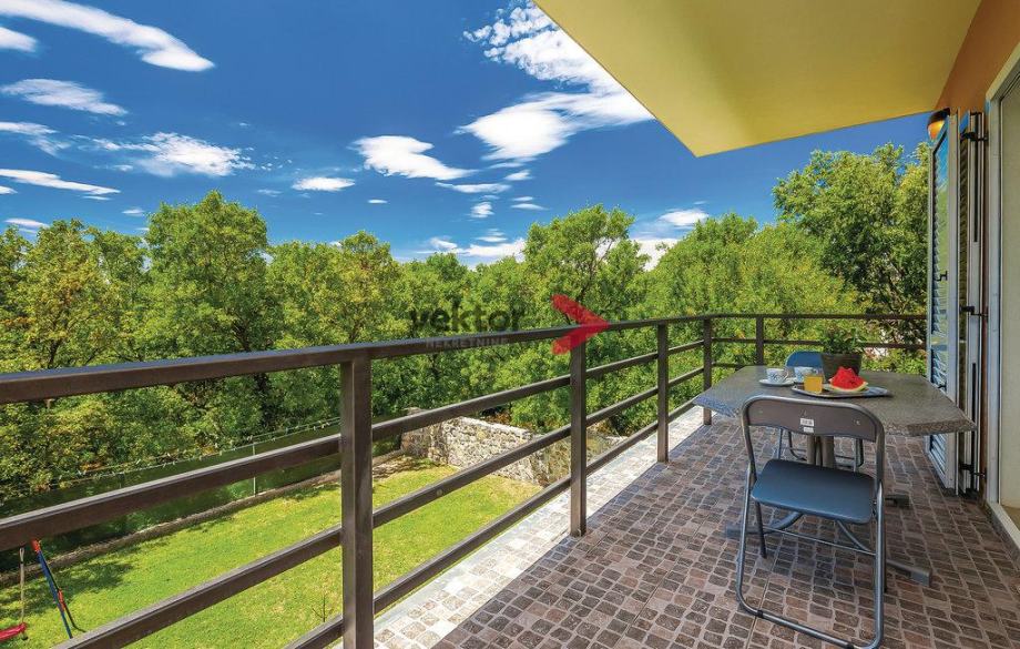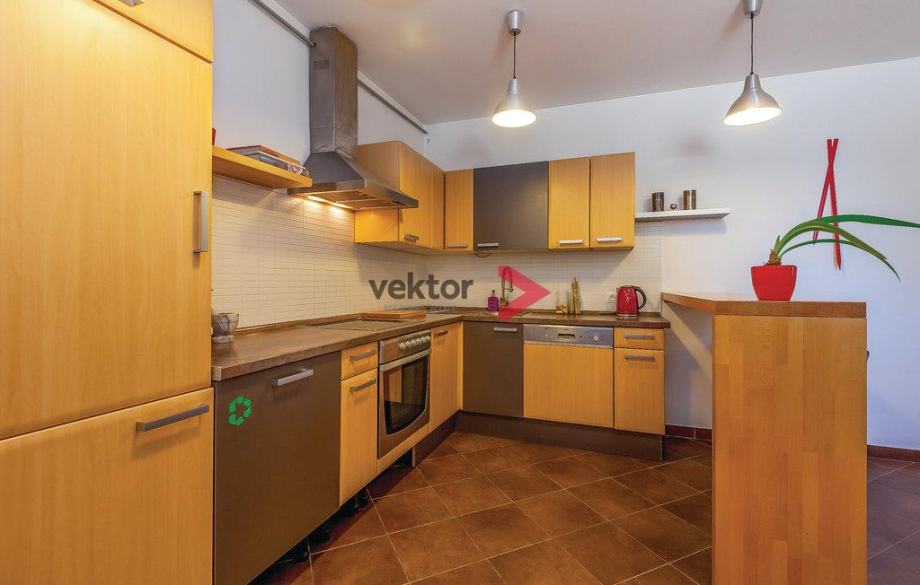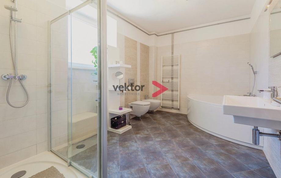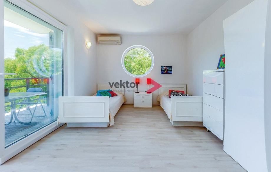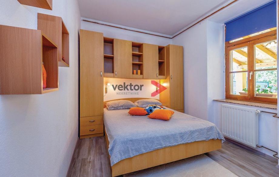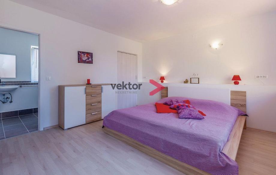 velikom kupaonom, kamene stepenice vode na kat gdje se nalaze još četiri sobe od kojih jedna ima vlastitu kupaonu. Iz prizemlja se izlazi na natkrivenu terasu sa roštiljem.