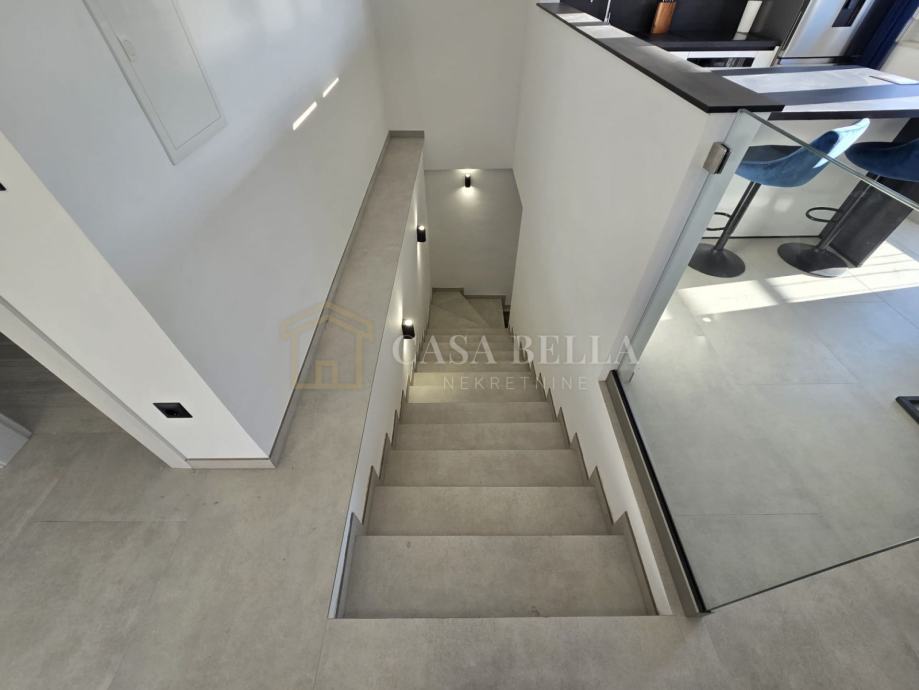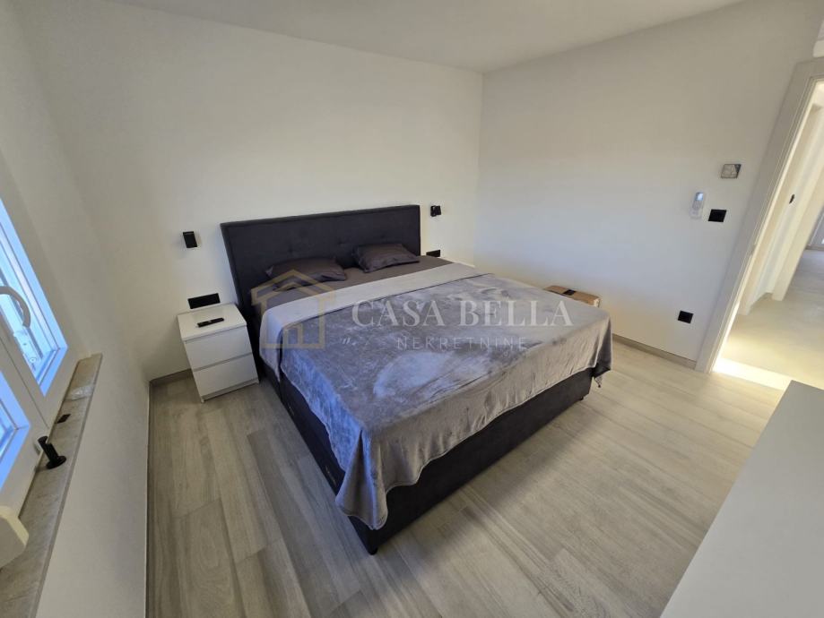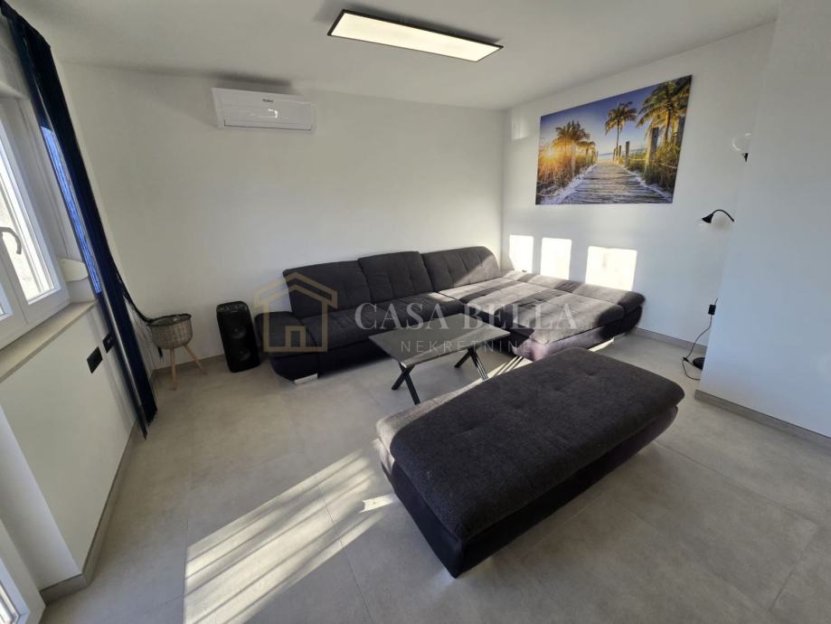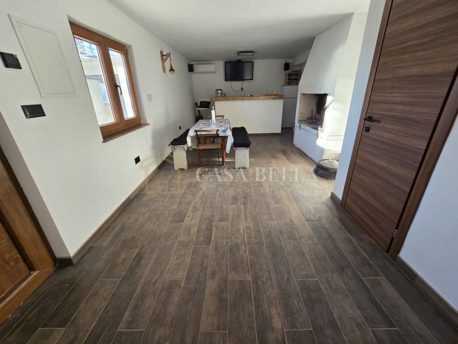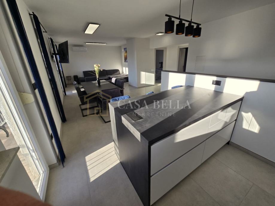 Kuća je potpuno namještena i opremljena modernim uređajima te pruža maksimalnu udobnost. Sastoji se od prostranog dnevnog boravka povezanog s kuhinjom i blagovaonicom u otvorenom konceptu, dvije udobne spavaće sobe i suvremene kupaonice. Stan ima veliku terasu s koje se pruža prekrasan panoramski pogled na more, savršenu za opuštanje i uživanje u zalascima sunca. Kroz cijeli kat i konobu je provedeno podno grijanje koje pruža iznimnu udobnost i luksuz tijekom cijele godine. U svim sobama su ugrađeni novi klima uređaji.
