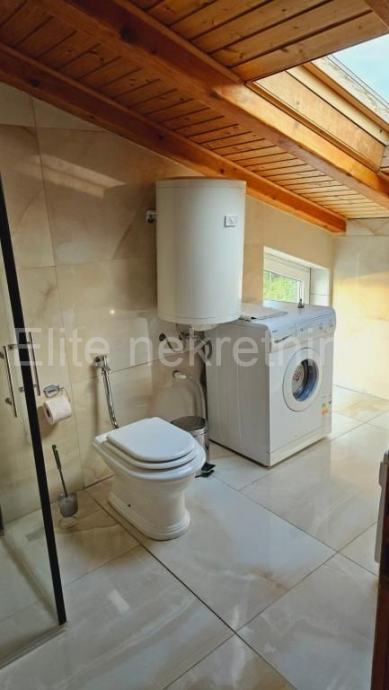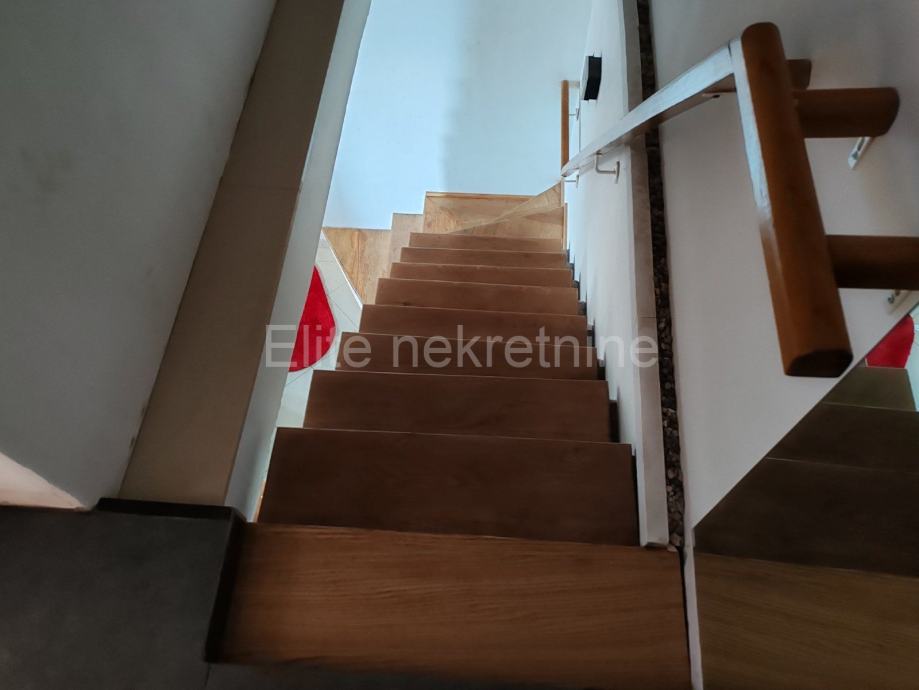 Stan je potpuno namješten i opremljen, a poseban ugođaj doprinosi kamin u dnevnom boravku, koji stanu daje osjećaj toplog doma. Keramičke pločice i drvene stube između etaža doprinose elegantnom dizajnu prostora.
