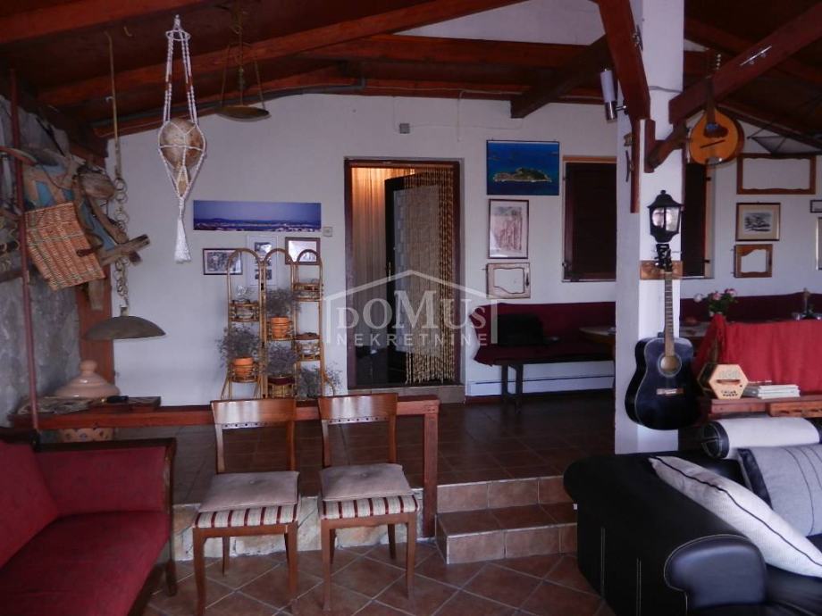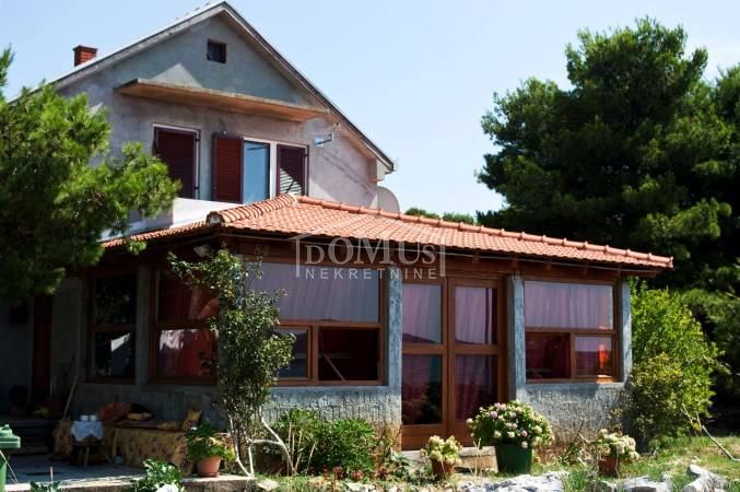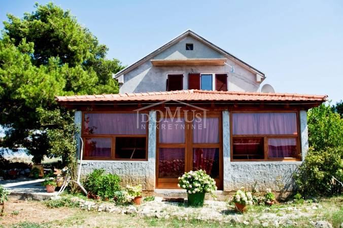 Samostojeća obiteljska vikendica, 1.red uz more sa prekrasnim pogledom, na atraktivnoj lokaciji za sve ljubitelje prirode i mira. Kuća ima ukupno 150m2 stambene površine na dvije etaže, smještena na parceli 755m2. U prizemlju se nalazi kuhinja sa blagovaonom iz koje se izlazi na terasu 17,80m2, veliki ostakljeni dnevni boravak od 42,50 m2 iz kojeg se pruža prekrasan pogled na more, jedna spavaća soba, garderoba/soba, kupaonica, hodnik i ostava. U prizemlju se također nalaze mala vanjska kuhinja i još jedna kupaonica. Unutarnje stepenice vode za kat (potkrovlje) gdje su smještene tri spavaće sobe, svaka soba ima balkon sa pogledom na more, hodnik i kupaona. Kuća je kompletno uređena i useljiva, klimatizirana, sa električnim grijanjem, drvena stolarija sa izo staklima. Kuća ima pogled na more sa obje etaže i iz svih prostorija na sve četiri strane. Postoji mogućnost veza za brod.