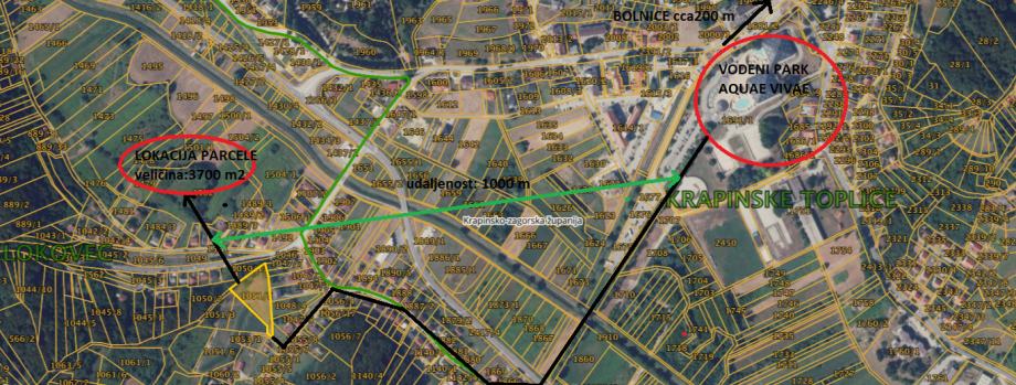 Istaknuti svakako treba sjajnu lokaciju pošto je udaljenost pješke od parcele do vodenog parka Aquae Vivae točno 1000 metara, a pritom se prolazi kroz prekrasnu aleju kestena. Zemljište je sa zapadne strane omeđeno šumom, sjeverne i istočne oranicom što daje vrlo zanimljivu mikrolokaciju nekome tko želi privatnost, a opet blizinu svih bitnih sadržaja.