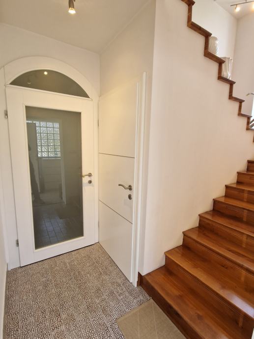Donju etažu čini ulazni hol, kupaonica sa WC-om, spomenuta kuhinja sa blagovaonom, odvojeni dnevni boravak koji vodi do jedne manje spavaće sobe.