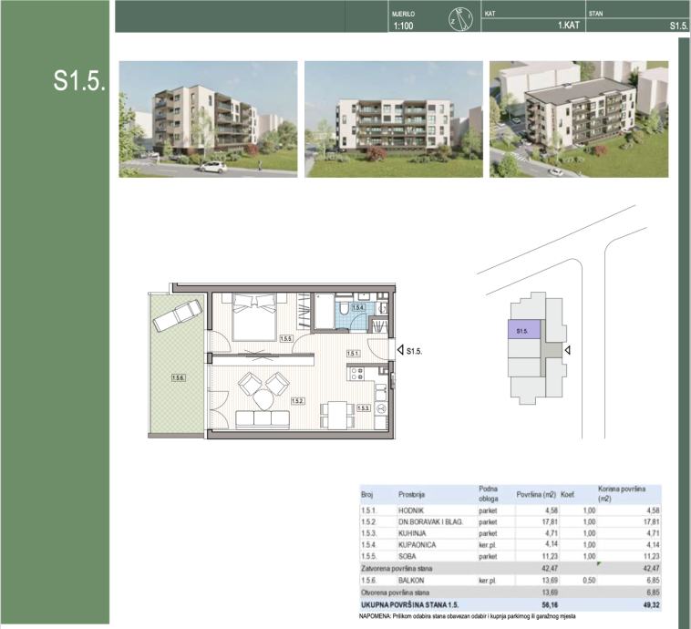 Dvosoban stan na 1. katu stambene zgrade zatvorene površine 42,47 m2 s balkonom 13,69 m2 (NKP 6,85 m2), ukupni NKP 49,32 m2.Stan S-1-5 sastoji se od ulaznog prostora, dnevnog boravka s blagovaonicom, kuhinje, kupaonice, spavaće sobe i balkona.Obavezna kupnja vanjskog ili garažnog parkirnog...Za ovu nekretninu kontaktirajte agenta na broj telefona +385 99 475 4113.Više na Eurovilla.hr, ID: 145310Direktan link: https://eurovilla.hr/nekretnina/krapinske-toplice-dvosoban-stan-50-m2-na-1-katu-novogradnja/145310/-----One-bedroom apartment on the 1st floor of a residential building with a closed area of 42.47 m2 with a balcony of 13.69 m2 (NUA 6.85 m2), total NUA 49.32 m2.Apartment S-1-5 consists of an entrance hall, living room with dining room, kitchen, bathroom, bedroom and balcony.Purchase of an outdoor or... For this property contact our agent on telephone number +385 99 475 4113.More on Eurovilla.hr, ID: 145310Direct link: https://eurovilla.hr/en/property/krapinske-toplice-one-bedroom-apartment-50-m2-on-the-1st-floor-new-building/145310/...