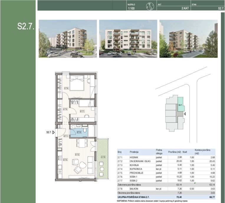 Trosoban stan na 2. katu stambene zgrade zatvorene površine 63,14 m2 s balkonom 7,26 m2 (NKP 3,63 m2), ukupni NKP 66,77 m2.Stan S-2-7 sastoji se od ulaznog prostora, dnevnog boravka s blagovaonicom, kuhinje, kupaonice, dvije spavaće sobe i natkrivenog balkona.Obavezna kupnja vanjskog ili...Za ovu nekretninu kontaktirajte agenta na broj telefona +385 99 475 4113.Više na Eurovilla.hr, ID: 883934Direktan link: https://eurovilla.hr/nekretnina/krapinske-toplice-trosoban-stan-67-m2-na-2-katu-novogradnja/883934/-----Two-bedroom apartment on the 2nd floor of a residential building with a closed area of 63.14 m2 with a balcony of 7.26 m2 (NPA 3.63 m2), total NPA 66.77 m2.Apartment S-2-7 consists of an entrance hall, living room with dining room, kitchen, bathroom, two bedrooms and a covered balcony.Mandatory... For this property contact our agent on telephone number +385 99 475 4113.More on Eurovilla.hr, ID: 883934Direct link: https://eurovilla.hr/en/property/krapinske-toplice-two-bedroom-apartment-67-m2-on-the-2nd-floor-new-building/883934/...