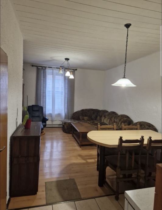 Stan ima jednu kupaonicu s WC-om. Namještaj - sofa, blagovaonski stol sa stolicama i komoda - vidljiv na fotografijama.