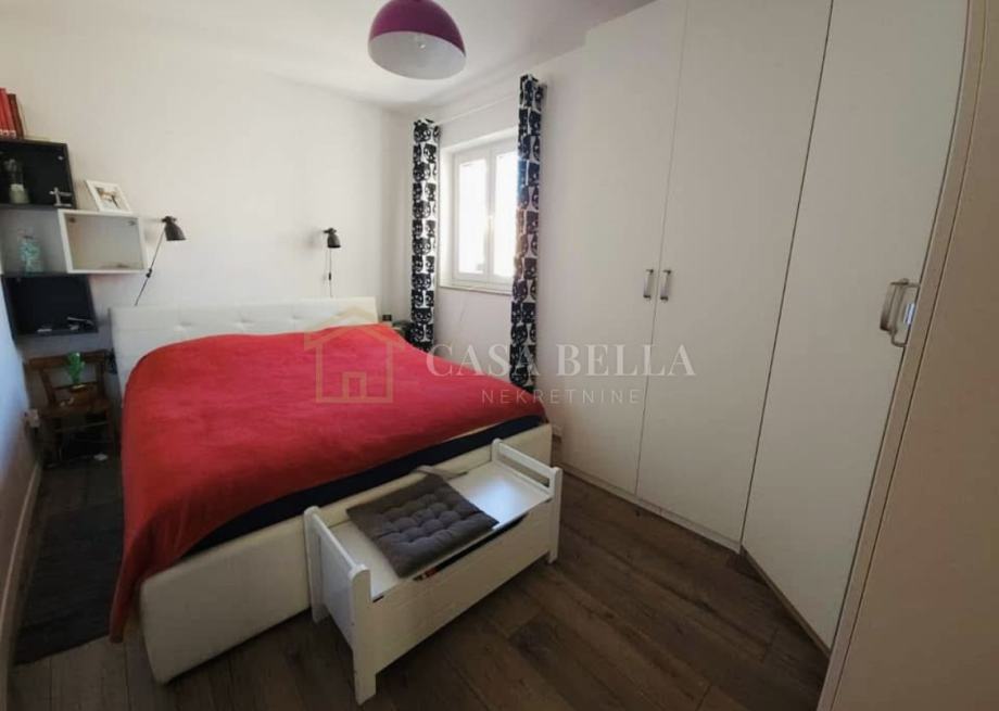 Stan se nalazi na 1. katu manje uredne stambene zgrade koja ima samo šest stanova, što osigurava privatnost i mir. Površina stana iznosi 57,35 m² i sastoji se od predsoblja površine 3,50 m², smočnice od 0,95 m², spavaće sobe od 11,50 m², druge spavaće sobe od 9,00 m², kupaonice od 4,10 m², kuhinje i dnevnog boravka od 20,60 m² te terase površine 7,70 m².