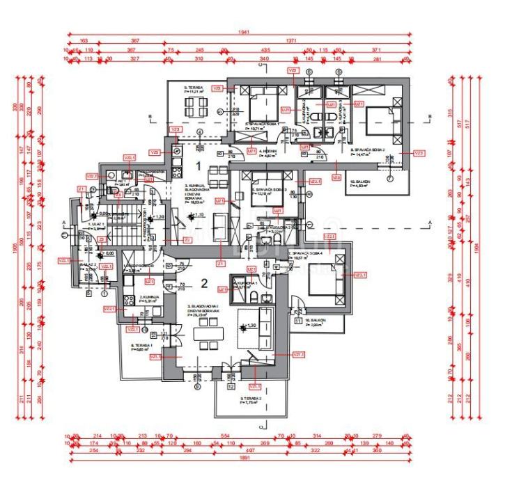 - **Tip stana:** 2 spavaće sobe + dnevni boravak sa blagavaonicom i kuhinjom + 2 kupaonice + natkrivena terasa