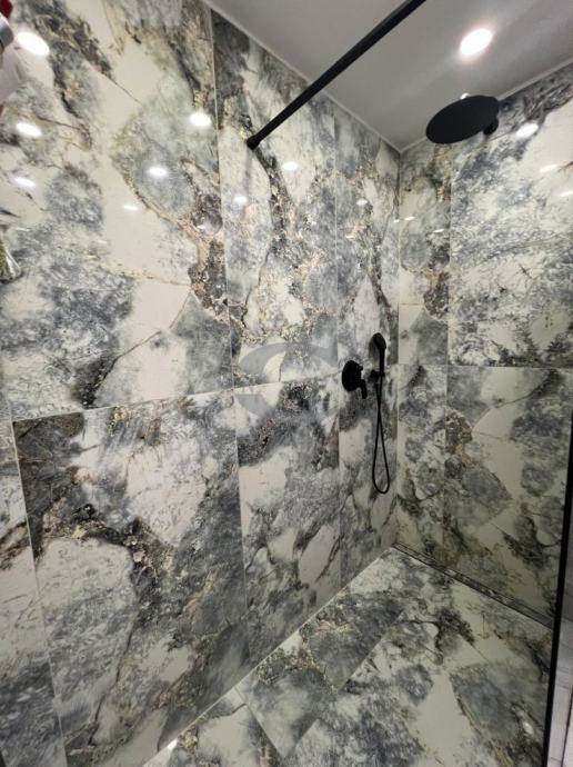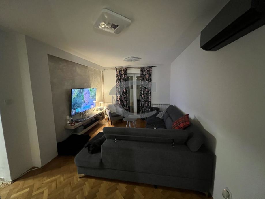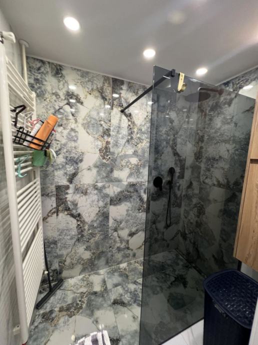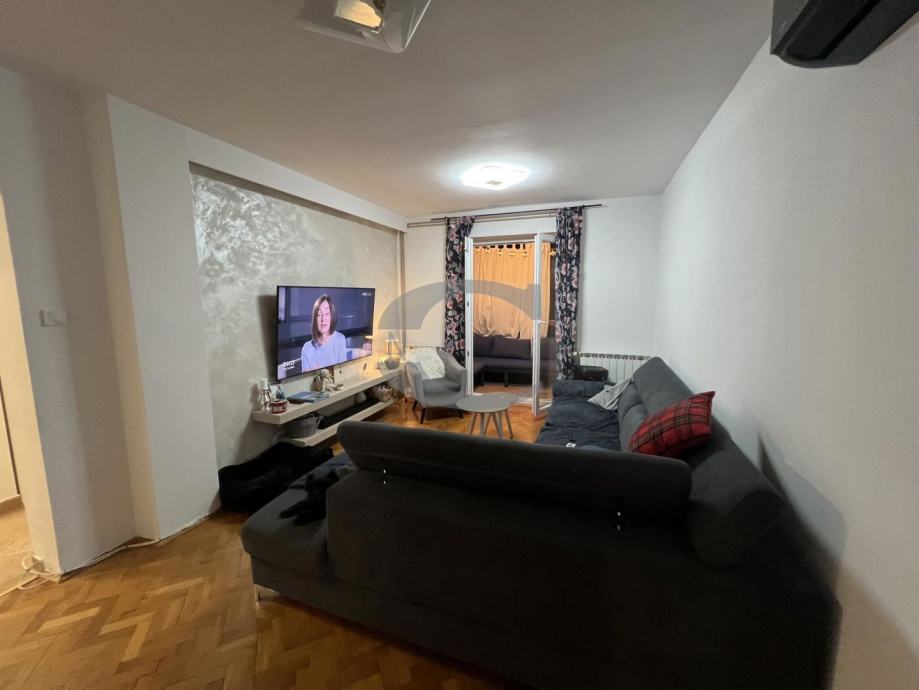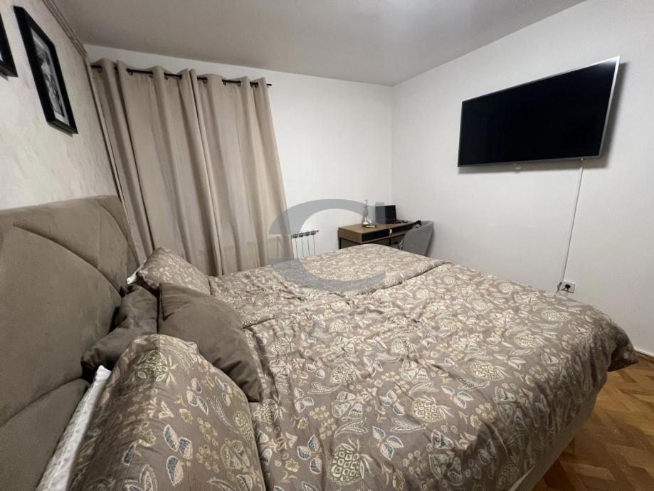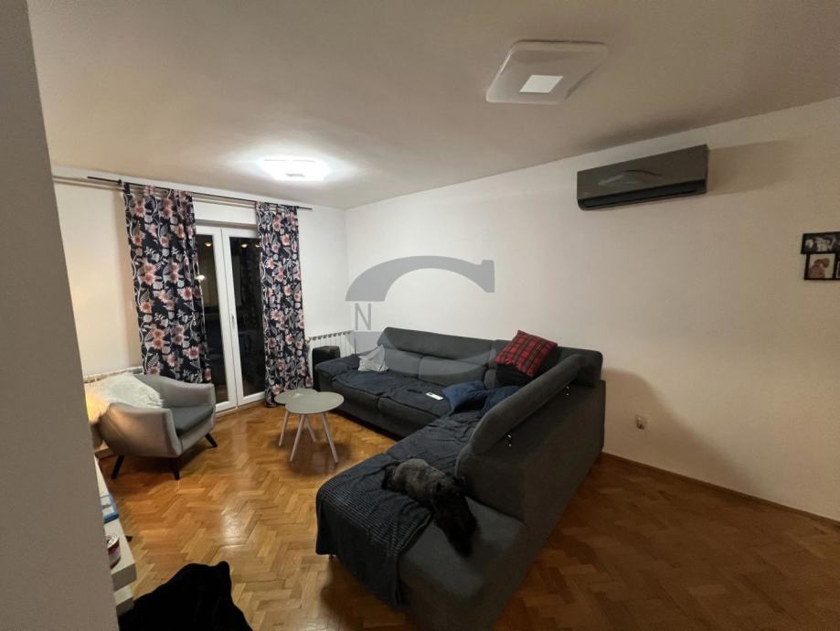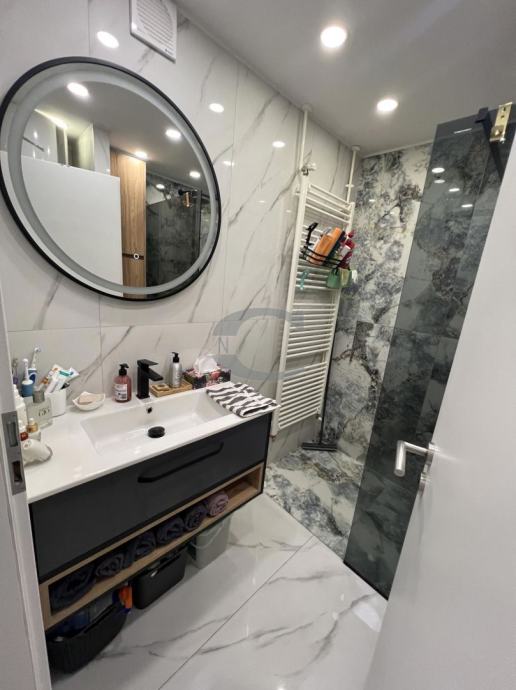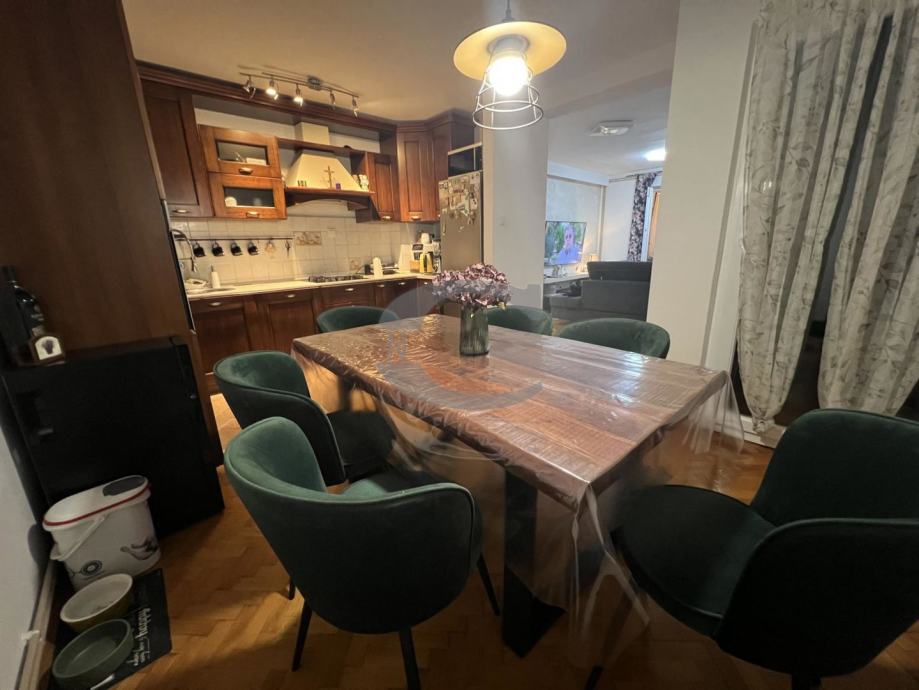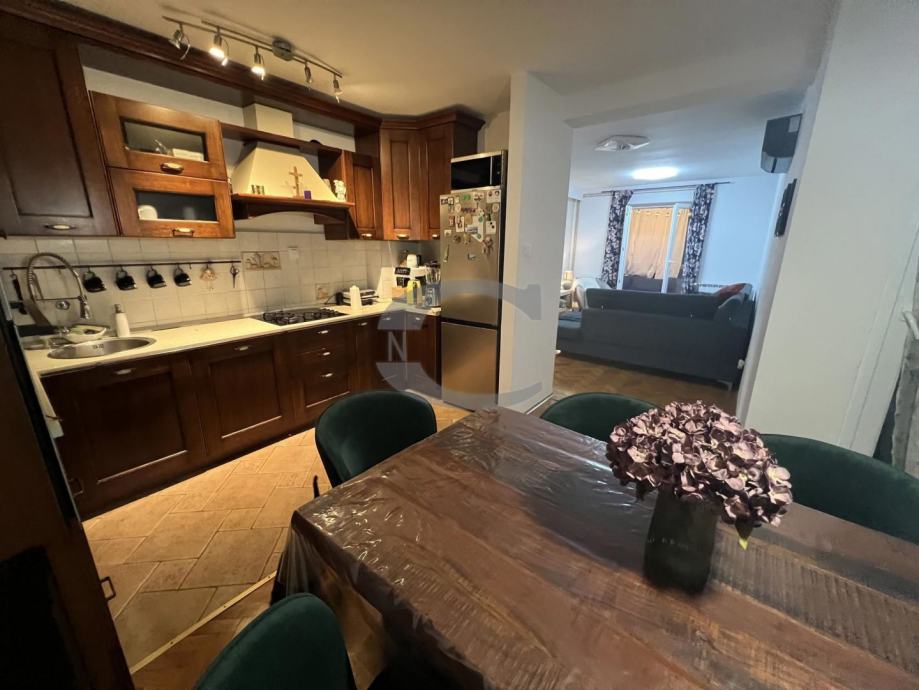 Dva balkona, sprmište/Špajza, spremište u podrumu, centelno grijanje, klimatiziran, potpuno namješten renoviran u 10 mj. 2024 g, parking, igralište za djecu.