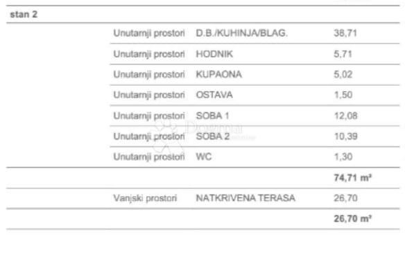 Apartman se sastoji od dvije spavaće sobe, ostave, kupaonice te prostrane kuhinje, blagovaonice i dnevnog boravka iz kojih se izlalzi na veliki balkon.