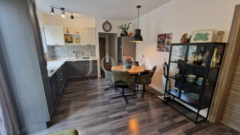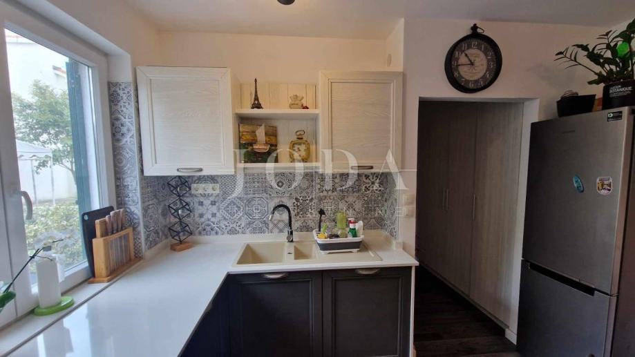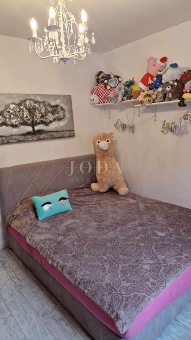 Apartman površine cca.55 m2 sastoji se od ulaznog prostora, dvije spavaće sobe, kupaonice, kuhinje s blagovaonicom i dnevnim boravkom koji ima izlaz na terasu površine 10 m2 i na okućnicu površine 30 m2, koja se može koristiti. Grijanje je putem klima uređaja. Prodaje se namješten. Ima jedno parkirno mjesto.
