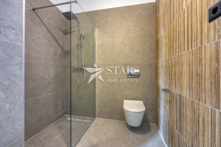 U prizemlju se nalaze dvije spavaće sobe, kupaonica, ostava te master spavaća soba s vlastitom kupaonicom i garderobom. Sve sobe imaju direktan izlaz na uređenu okućnicu površine 300 m² s vrtom, sunčalištem i bazenom.
