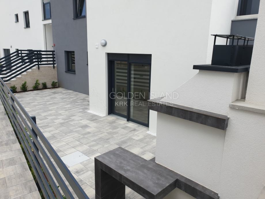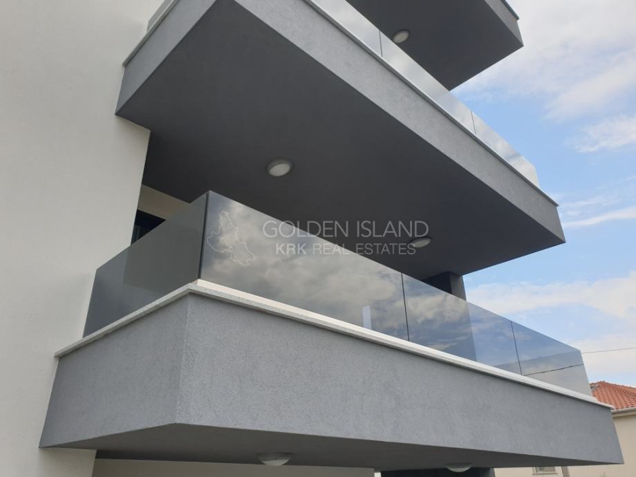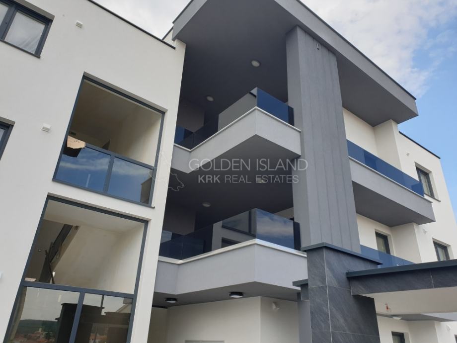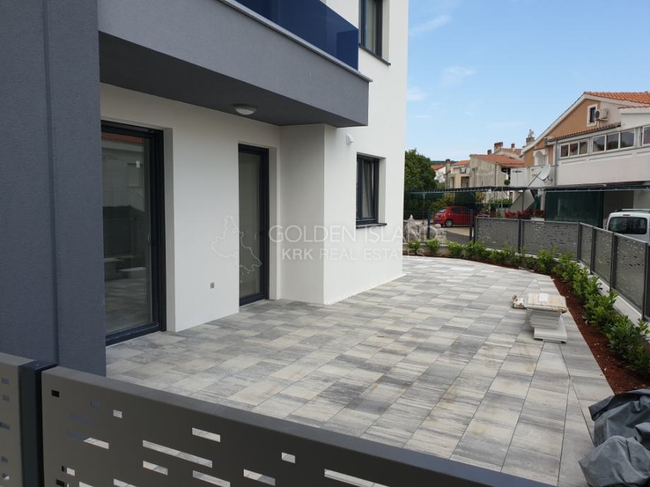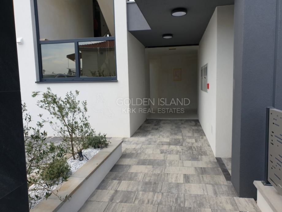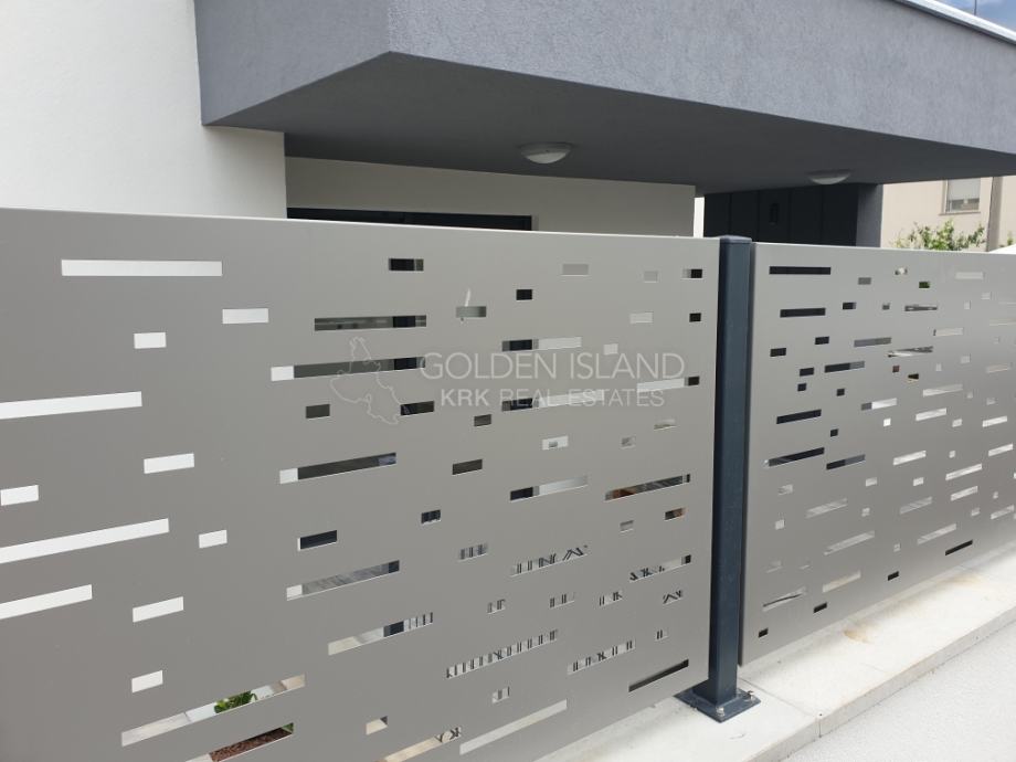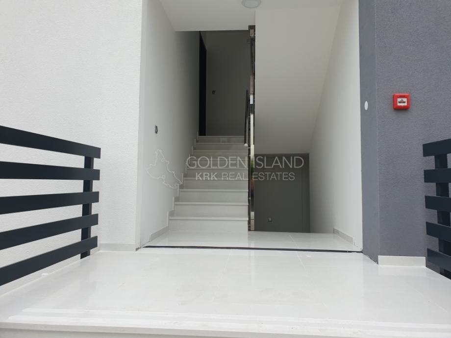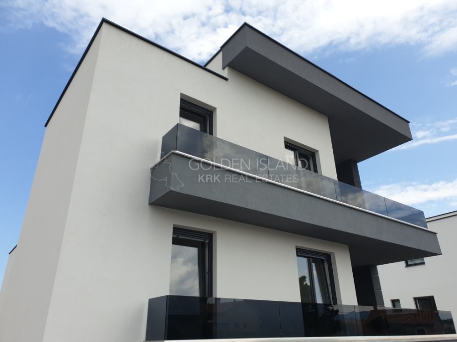 Luksuzna novogradnja na apsolutno Top lokaciji, u mirnoj ulici, na laganoj uzvisini, a samo par minuta do rive Grada Krka, 5 min do plaže i zelene rekreacione zone.