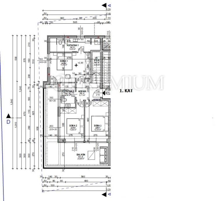 Dvoetažni apartman neto površine 167 m2 (brutto površina 270,00 m2) se na 1. katu sastoji od ulaznog prostora, dvije kupaonice, te 3 spavaće sobe s izlazom na natkriveni balkon s kojeg se pruža otvoreni pogled na more.