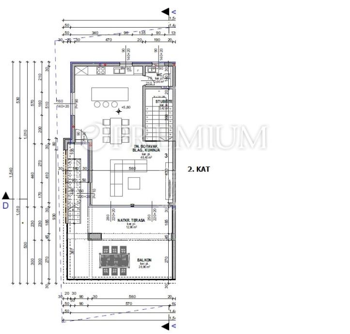Unutarnjim stepeništem dolazi se na 2. kat koji se sastoji od toaleta, kuhinje s blagovaonom i prostranog dnevnog boravka s izlazom na terasu s koje se pruža predivan pogled na more. Vanjskim stubištem dolazi se na krovnu terasu (cca.60 m2) s bazenom i sunčalištem.