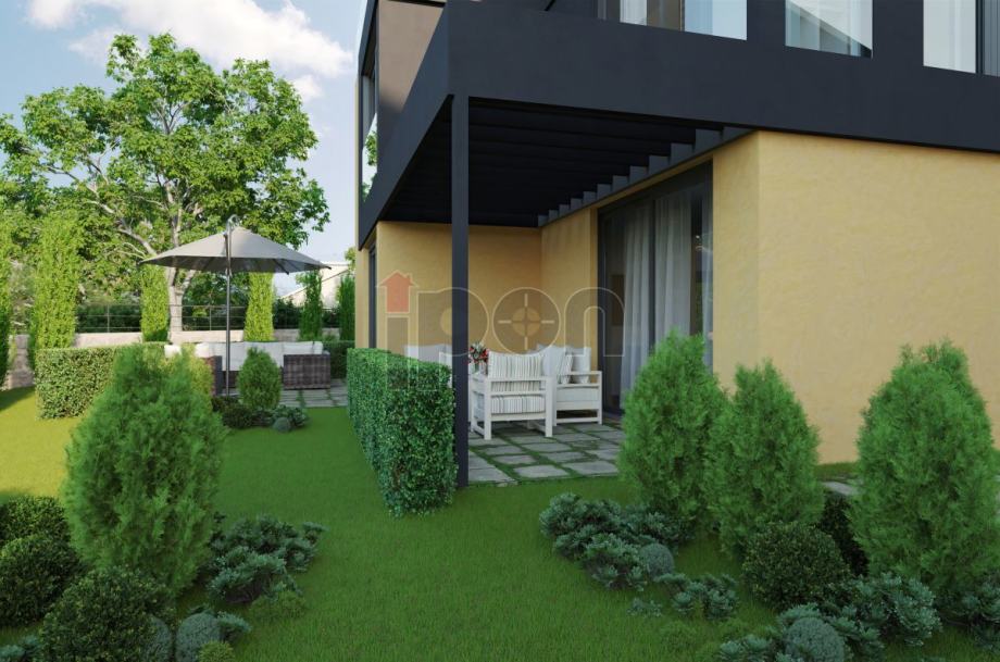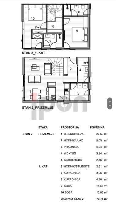 U prodaji je dvoetažni stan površine 79,75 m2 koji se nalazi na prizemlju i katu novogradnje smještene na vrlo lijepoj lokaciji. Sastoji se od prizemlja gdje se nalazi dnevni boravak sa kuhinjom i blagovaonicom, hodnik, kupaonica sa wc-om, vešeraj, terasa i stubišta koji vodi na kat gdje su smještene dvije spavaće sobe od kojih jedna soba ima izlaz na terasu, garderoba, dvije kupaonice i hodnik. Kvalitetna gradnja i materijali, aluminijska stolarija, klimatizacija, podno grijanje, dva parkirna mjesta, uređena okućnica. Atraktivna lokacija zgrade udaljene 600 m od mora! Završetak radova 9. mjesec 2024. godine.