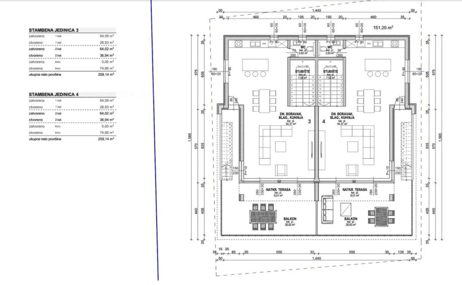 Unutar luksuzno izgrađenog objekta, stan se nalazi na etaži 1 i 2. Ukupna površina dvoetažnog apartmana iznosi 167 m2. Na 1. katu apartmana se nalazi ulazni hodnik, tri spavaće sobe, 2 kupaonice, natkrivena terasa i balkon. Unutarnjim stepeništem dolazi se na kat gdje se nalazi dnevni boravak, kuhinja s blagovaonicom, wc.