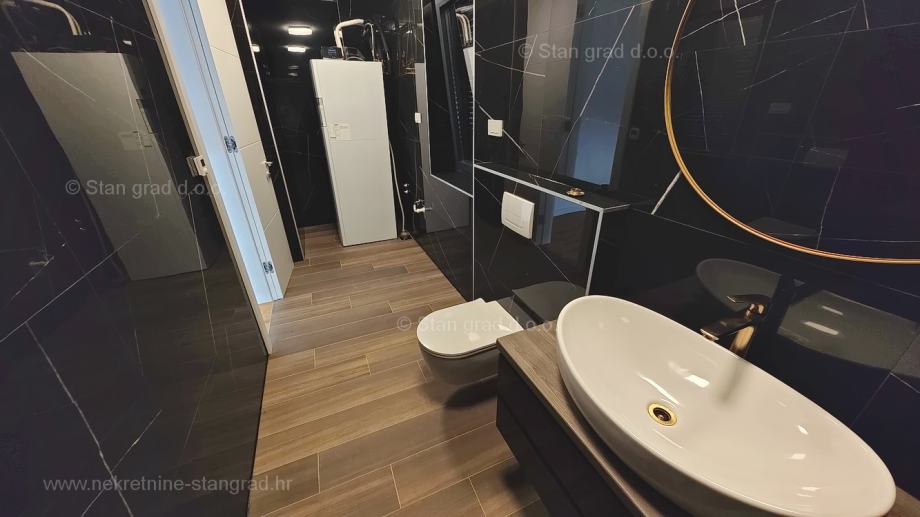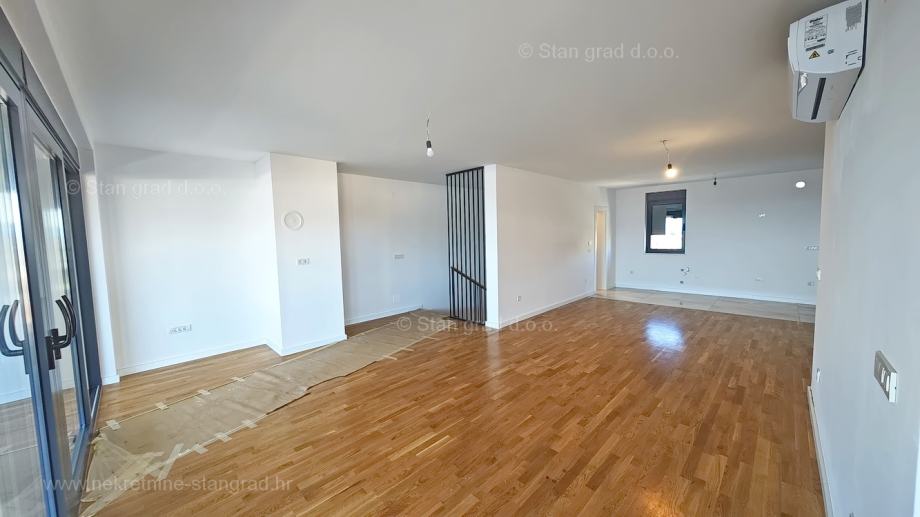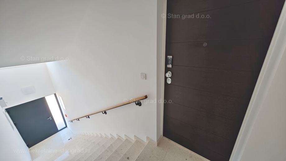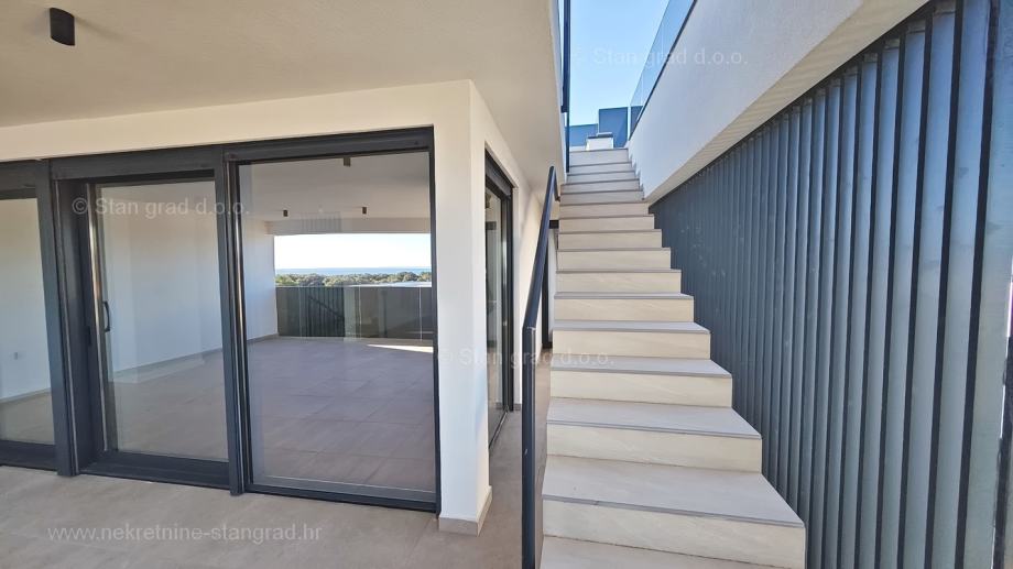 Unutar luksuzno izgrađenog objekta, stan se nalazi na etaži 1 i 2. Ukupna površina dvoetažnog apartmana iznosi 167 m2. Na 1. katu apartmana se nalazi ulazni hodnik, tri spavaće sobe, 2 kupaonice, natkrivena terasa i balkon. Unutarnjim stepeništem dolazi se na kat gdje se nalazi dnevni boravak, kuhinja s blagovaonicom, wc.