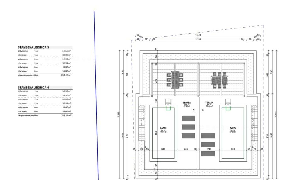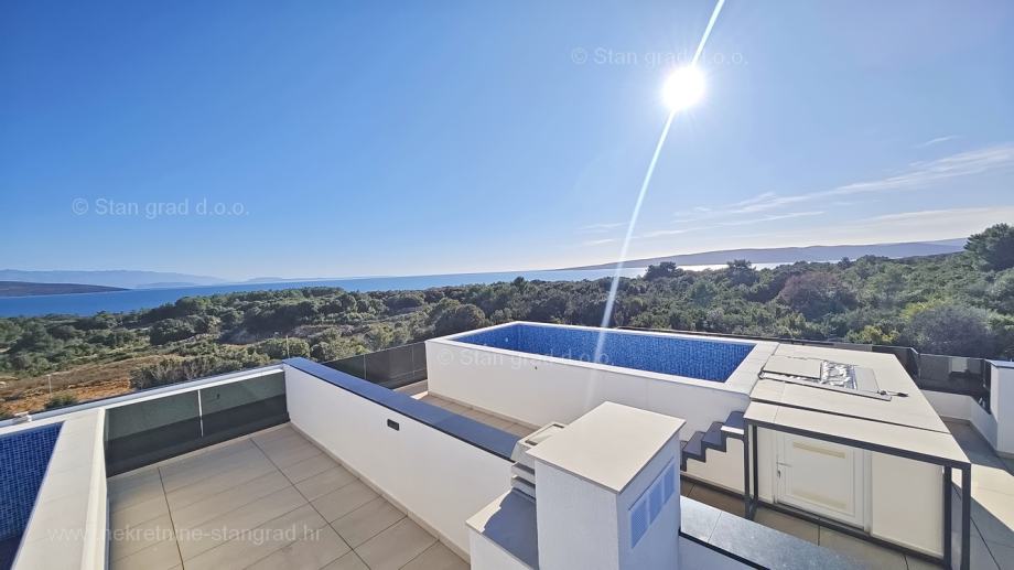 Vanjskim stubištem dolazi se na krovnu terasu koja sadrži bazen i strojarnicu. S krovne terase pruža se panoramski pogled na more. Uz apartman, novi vlasnik nekretnine na raspolaganju ima dva parkirna mjesta. Uzimajući u obzir sve prohodne unutarnje i vanjske površine, uključujući terase i parkirna mjesta, apartman raspolaže stvarnom bruto iskoristivom površinom od 270 m2.
