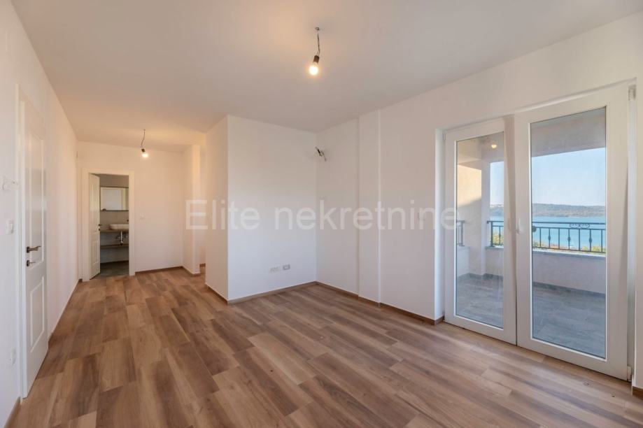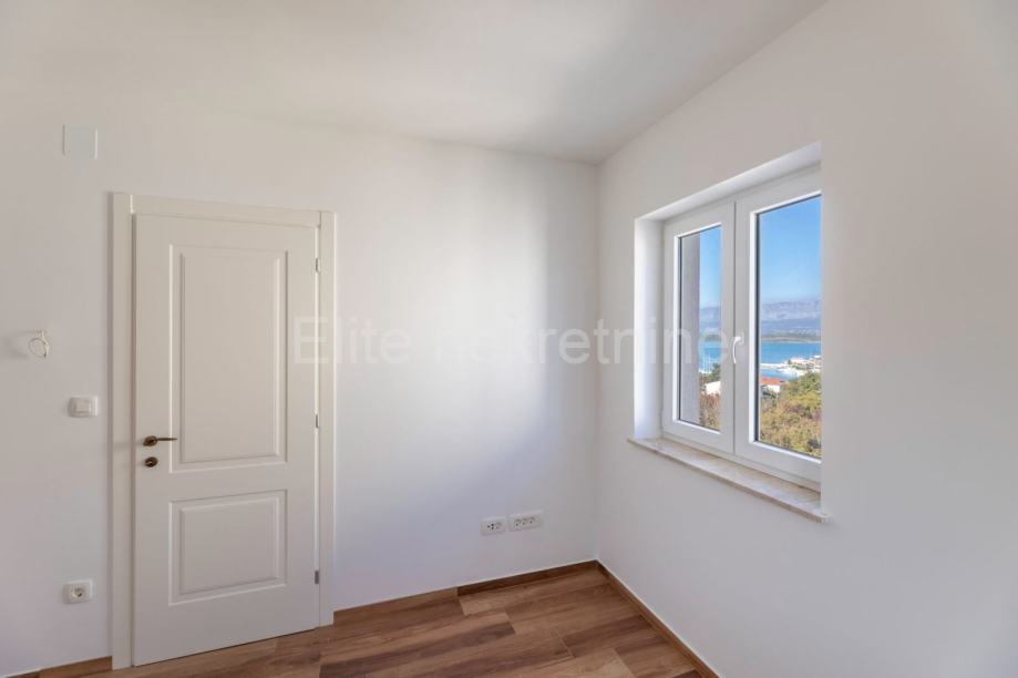 Manja stambena jedinica površine 47m2 na stražnjoj strani kuće sastoji se od otvorenog dnevnog boravka s kuhinjom, kupaone i sobe. Vanjski dio ima prostrano dvorište, terasu s pogledom na more te parkirno mjesto.