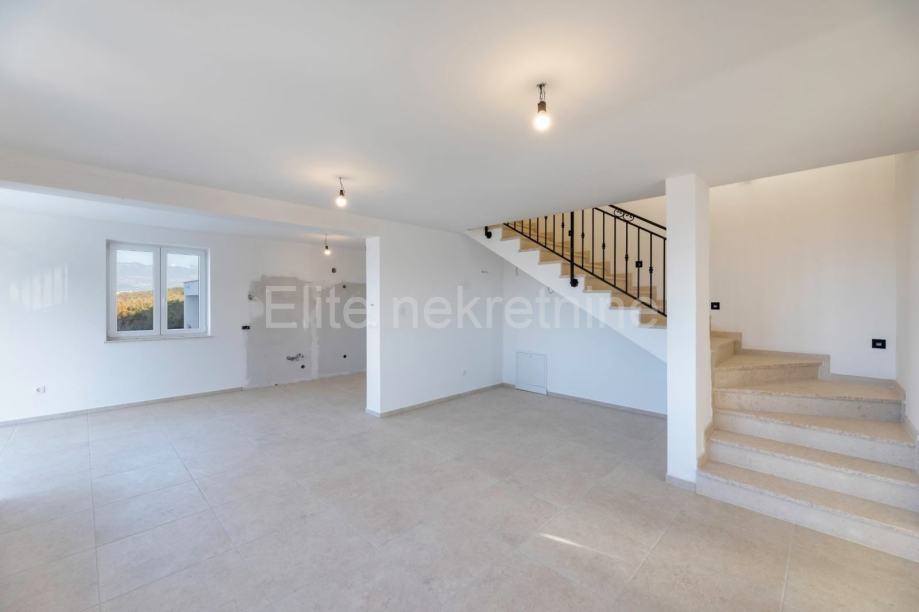 Veća stambena jedinica površine 159m2 na prvoj etaži ima prostrani dnevni boravak, otvorenu blagovaona i kuhinju s terasom (pogled na uvalu), ostavu, WC i ured s vanjskim ulazom. U vanjskom dijelu nalazi se mala terasa između maslina te dva parkirna mjesta.Otvorenim stubištem koje je popločeno kanfanar kamenom dolazi se na drugu etažu na kojoj se nalaze tri sobe od kojih najveća ima svoju kupaonu, garderobu i balkon s pogledom na cijelu uvalu, Crikvenicu i Rijeku. Preostale dvije sobe koriste zajedničku kupaonu. Na istoj etaži nalazi se i praona (može se prenamijeniti u sobu). Sklopivim ljestvama moguće je pristupiti potkrovlju.