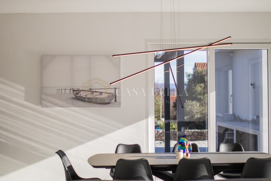 Ova moderna, sofisticirano opremljena vila s bazenom, saunom i teretanom savršeno spaja eleganciju, udobnost i funkcionalnost, nudeći idealno utočište za život ili odmor na prekrasnom Krku.