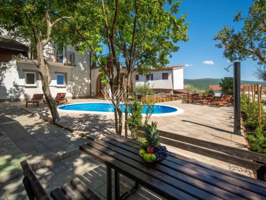 U prizemlju se nalazi kuhinja s blagovaonicom i dnevnim boravkom koji ima izlaz na terasu i sunčalište uz bazen, dvije spavaće sobe te kupaonica. Na katu su smještene četiri spavaće sobe, dvije s izlazom na terasu, dvije na balkon, te dodatna kupaonica. Visoko potkrovlje nudi dvije spavaće sobe i kupaonicu, uz mogućnost uređenja u studio apartman jer postoji instalacijska priprema za kuhinju.