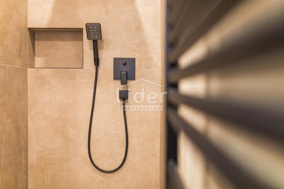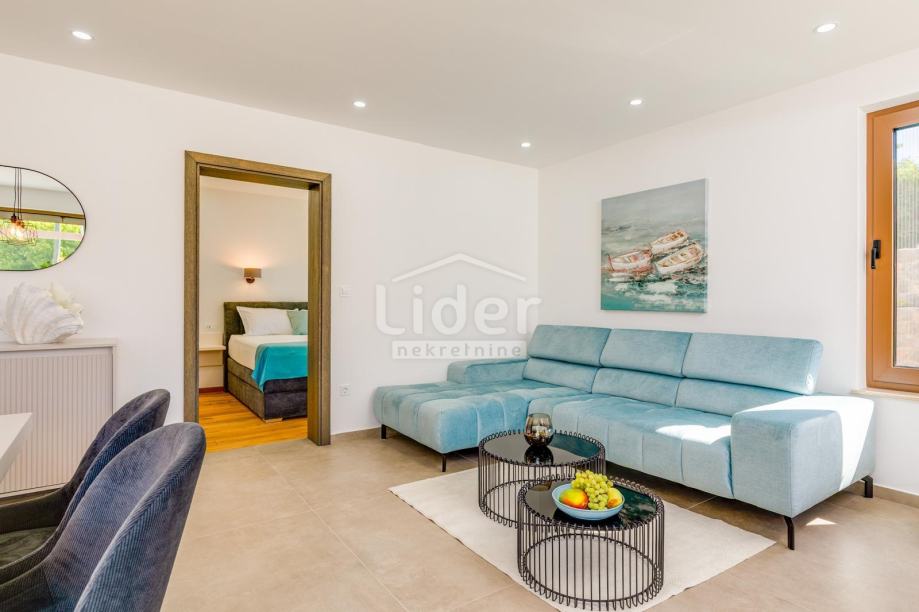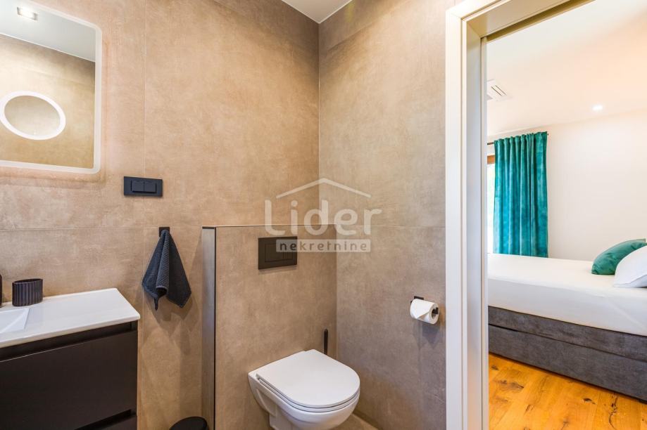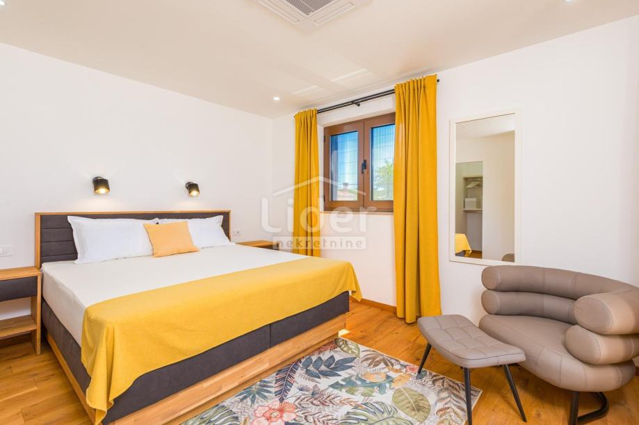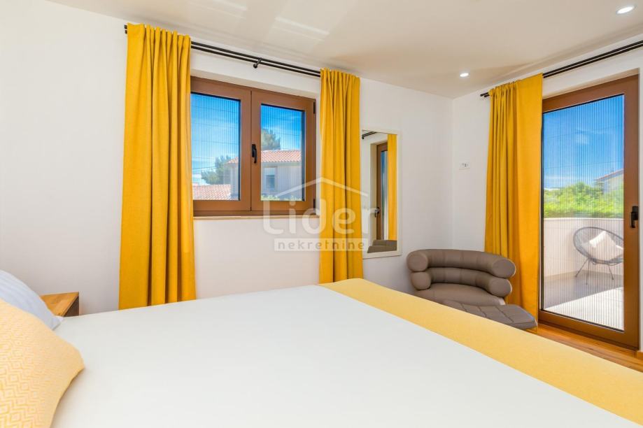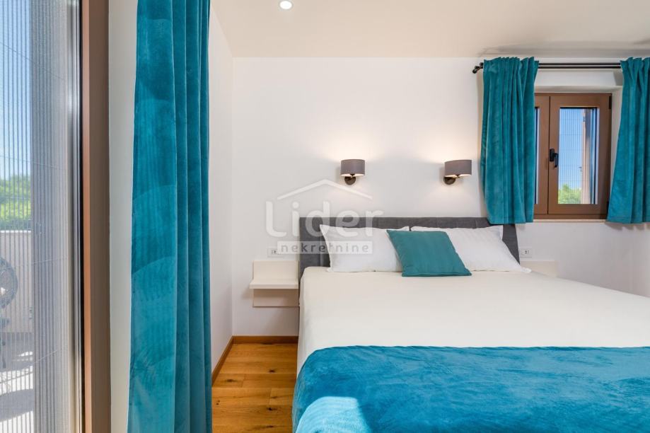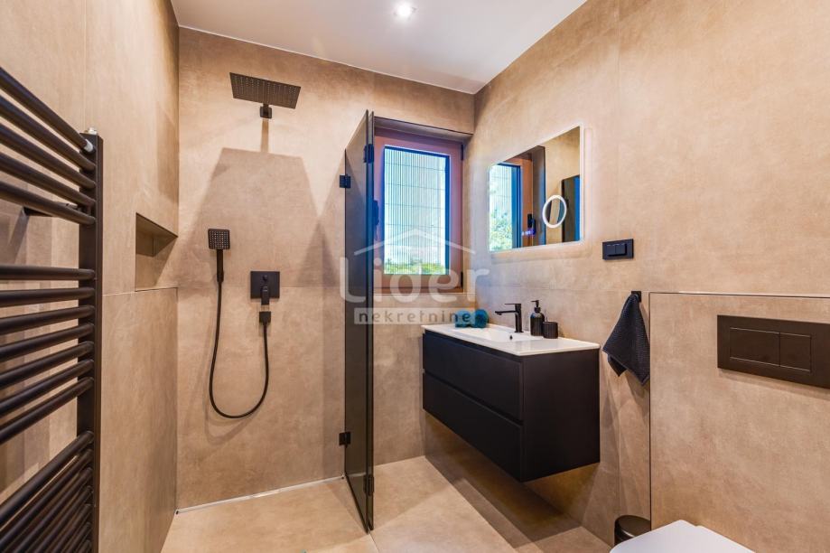 Ova novogradnja projektirana je kao izuzetno kvalitetna s odličnim, A+ energetskim svojstvima koja pružaju kvalitetna PVC stolarija, vrhunski klima uređaji, podno grijanje i kamin, kvalitetan parket u spavaćim sobama te protuprovalna ulazna vrata. Kuća raspolaže sa 145 m2 stambenog prostora raspoređenog na dvije etaže povezane unutarnjim stepeništem. Na prvoj etaži nalazi se open space s izlazom na natkrivenu terasu s kuhinjom, dnevnim boravkom i blagovaonom. Tu se nalazi još i soba s kupaonicom i posebnim WC-om te spremište. Na gornjoj etaži nalaze se dvije spavaće sobe od kojih svaka ima svoju kupaonicu i izlaz na natkrivenu terasu.