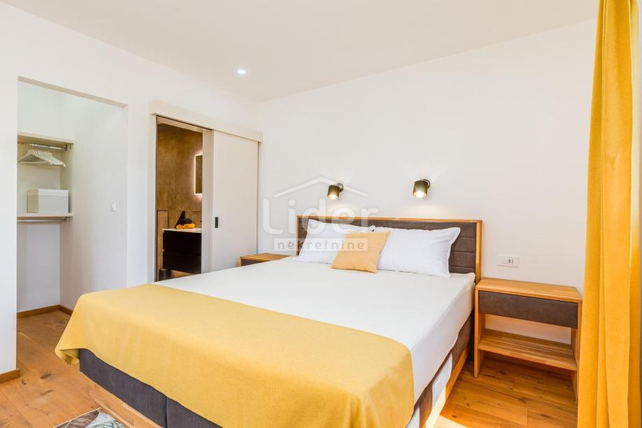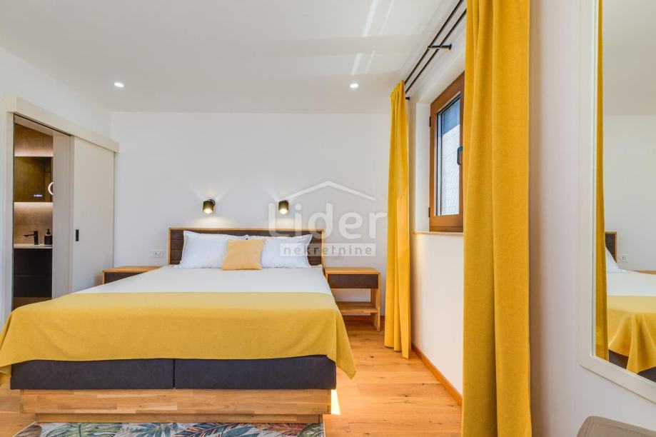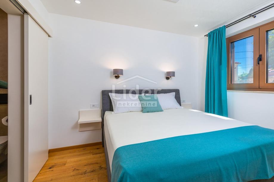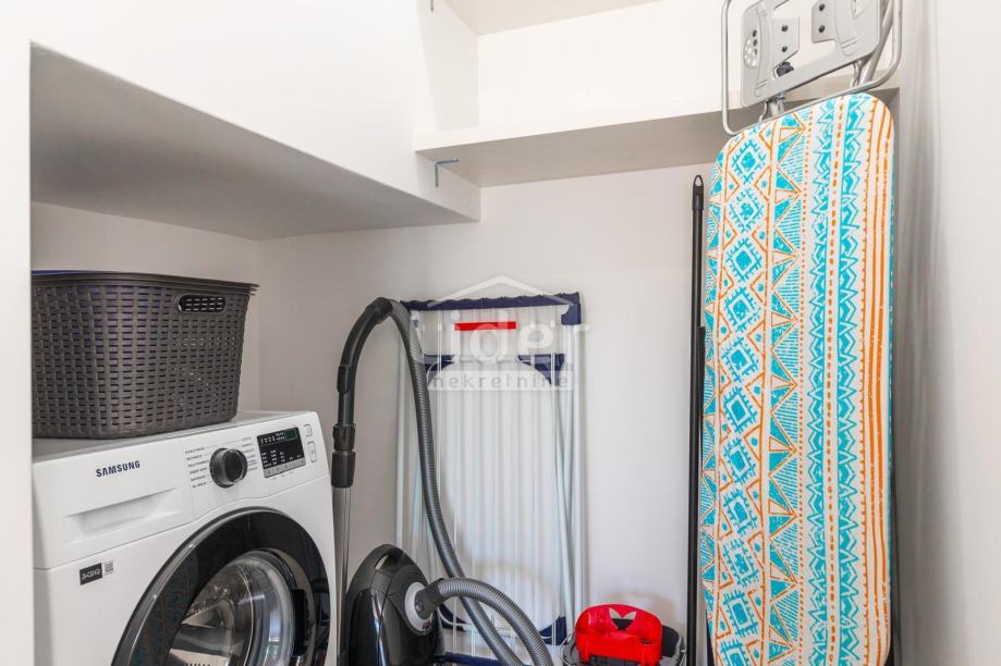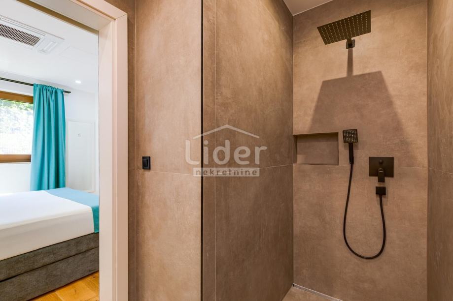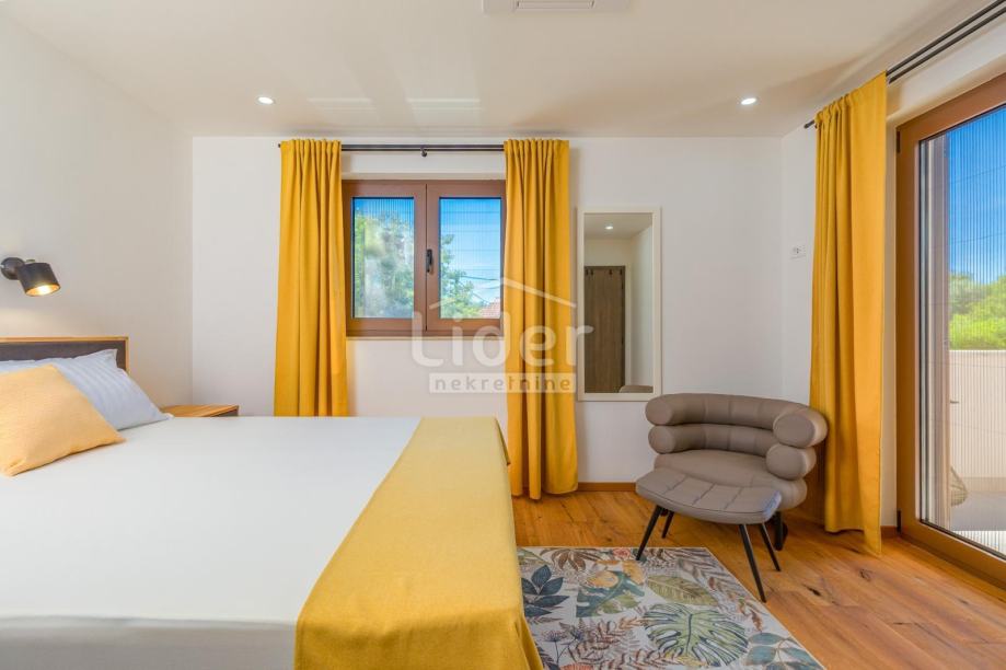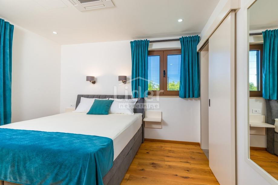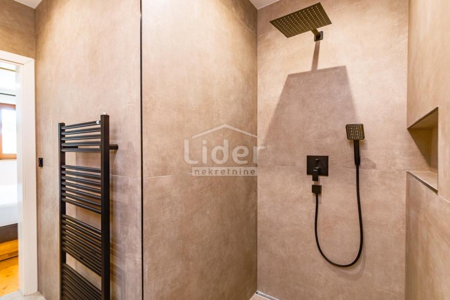 Ova novogradnja projektirana je kao izuzetno kvalitetna s odličnim, A+ energetskim svojstvima koja pružaju kvalitetna PVC stolarija, vrhunski klima uređaji, podno grijanje i kamin, kvalitetan parket u spavaćim sobama te protuprovalna ulazna vrata. Kuća raspolaže sa 145 m2 stambenog prostora raspoređenog na dvije etaže povezane unutarnjim stepeništem. Na prvoj etaži nalazi se open space s izlazom na natkrivenu terasu s kuhinjom, dnevnim boravkom i blagovaonom. Tu se nalazi još i soba s kupaonicom i posebnim WC-om te spremište. Na gornjoj etaži nalaze se dvije spavaće sobe od kojih svaka ima svoju kupaonicu i izlaz na natkrivenu terasu.