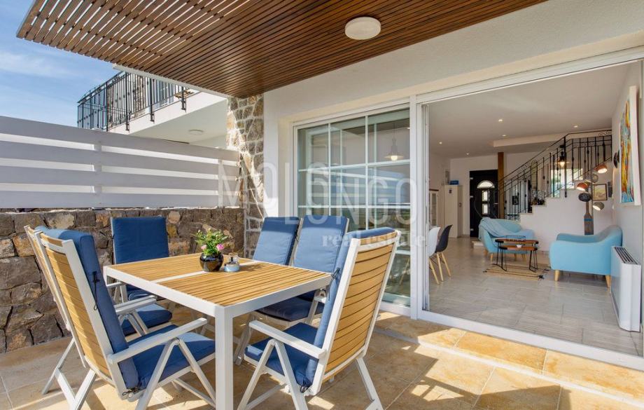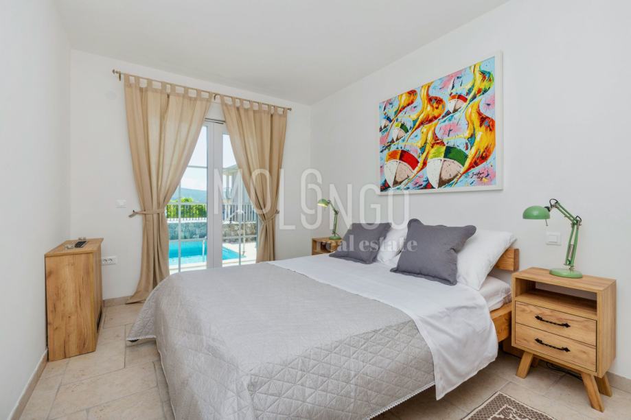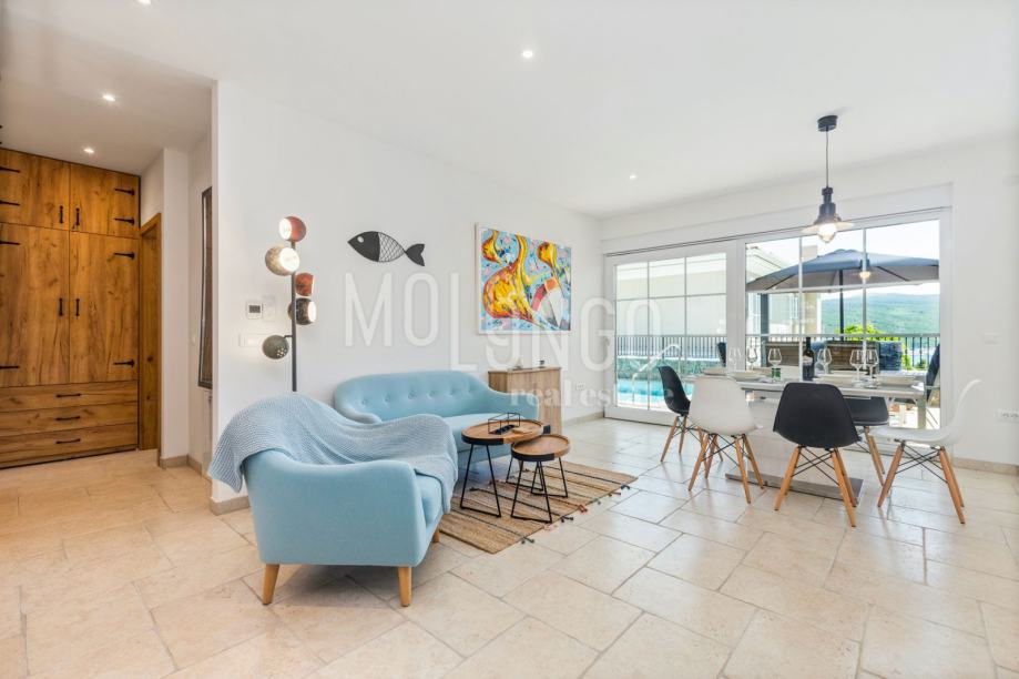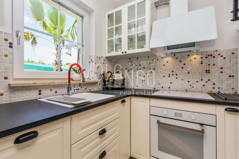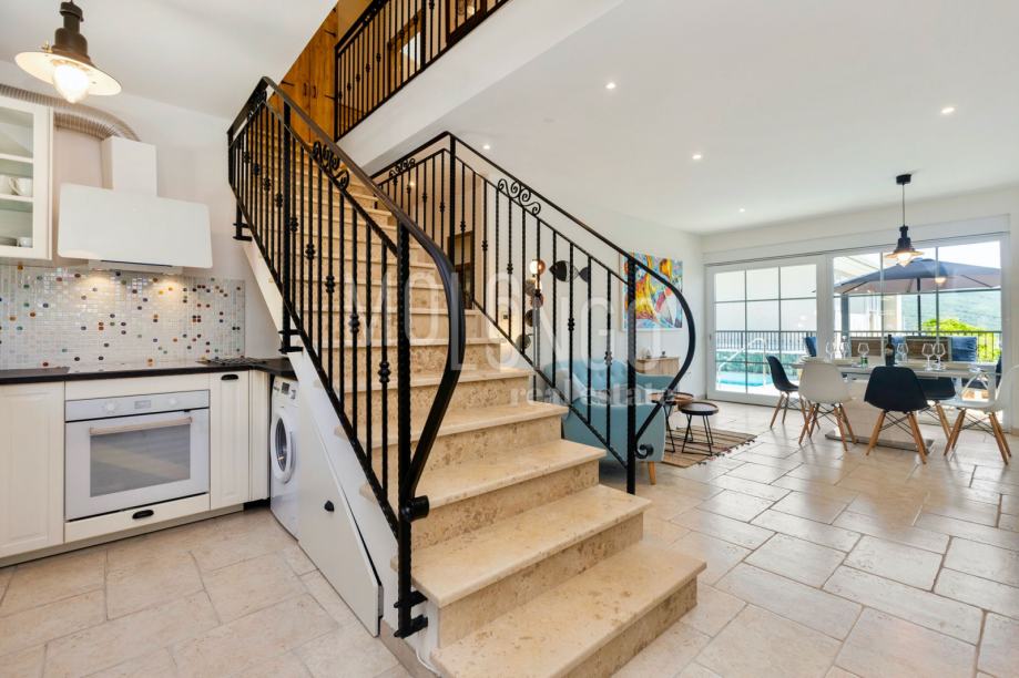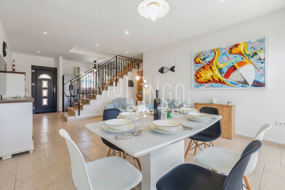 U prizemlju od gotovo 56 metara kvadratnih prevladava središnji otvoreni prostor koji dijeli funkciju dnevnog boravka, kuhinje i blagovaonice iz koje se izlazi na vanjsku, djelomično natkrivenu, terasu s bazenom. Vanjski prostor nudi savršeno mjesto za dijeljenje dragocjenih trenutaka s obitelji i prijateljima uz sunčalište, bazen i roštilj. U prizemlju se još nalazi jedna spavaća soba te kupaonica. Unutrašnje stubište izrađeno od kamena s kovanom ogradom vodi na prvi kat gdje se na dodatnih 55 metara kvadratnih prostiru još dvije kupaonice te dvije spavaće sobe sa zajedničkim balkonom s kojeg se pruža pogled na more koje se nalazi svega dvanaest minuta hoda od kuće.