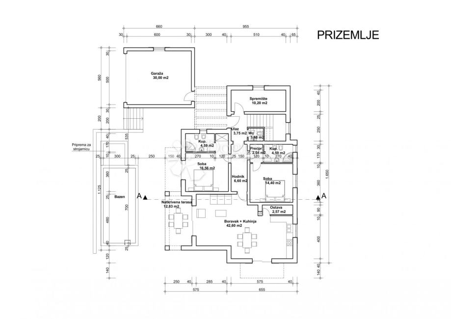 Prizemlje se sastoji od ulaznog hodnika, spremišta, dvije prostrane spavaće sobe od koji svaka ima svoju kupaonu, wc ,kuhinje sa dnevnim boravkom iz kojeg se izlazi na natkrivenu terasu, ostave i garaže.