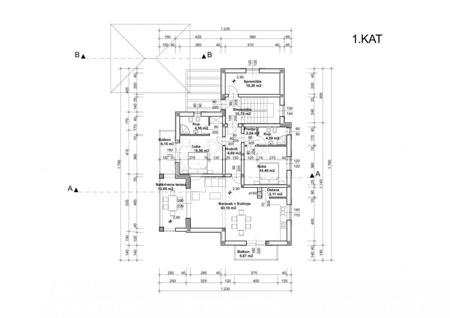 Prvi kat se sastoji od ulaznog hodnika , spremišta, dvije spavaće sobe od koji svaka ima svoju kupaonu, natkrivene terase, balkona, ostave , kuhinje sa dnevnim boravkom u zajedničkom prostoru i wc-a.
