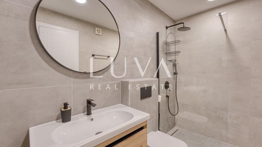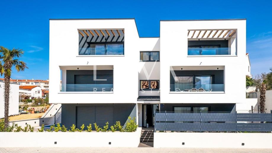 Prodaje se luksuzan dvoetažan stan u moderno uređenoj novogradnji u mjestu Krk na otoku Krk. Ova manja zgrada sa svega 4 stana je izgrađena 2022. godine, a cijeli posjed objekta je potpuno ograđen kako bi se osigurala privatnost. U prizemlju stana je smještena wellness prostorija sa saunom i Jacuzzijem, a iz te prostorije se izlazi na ograđeni vrt na kojem je smješten vanjski bazen. Na prvom katu se nalazi dnevni boravak i kuhinja iz koje se izlazi na lođu koja gleda na uličnu stranu. Na prvom katu su smještene i spavaće sobe, a sa stražnje strane je moguće izaći na još jednu veliku otvorenu terasu. Stan se prodaje potpuno namješten i opremljen te mu pripadaju 2 parking mjesta.