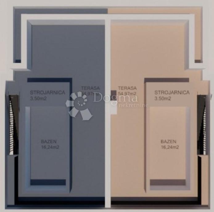 Vanjsko stepenište vodi na krovnu terasu veličine 78,65 m2 na kojoj se nalazi bazen i sunčalište s još jednim otvorenim pogledom na more.