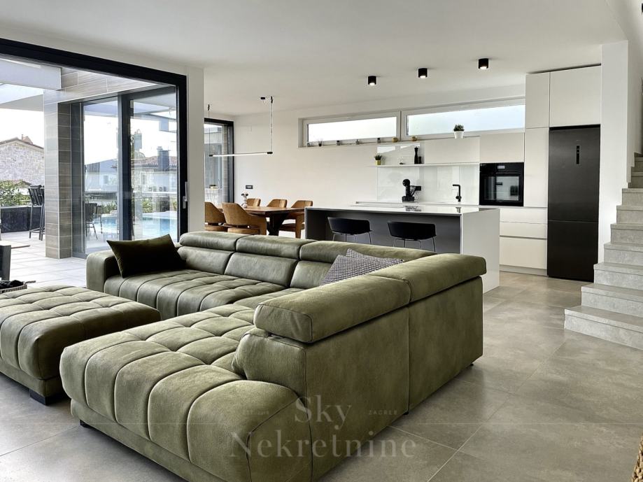 Eksterijer vile osmišljen je za potpuno uživanje – infinity bazen s prostorom za sunčanje, ljetna kuhinja s roštiljem, vanjski stol za blagovanje te dodatni prostor za kavu i brunch. Vila također ima parkirno mjesto za tri automobila, prostor za tehničke uređaje i pumpu za bazen.