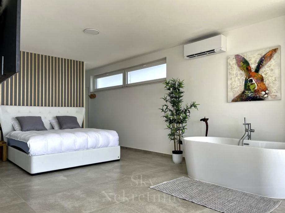 Na prvom katu nalazi se višenamjenski dnevni boravak ili ured s kaučom na razvlačenje i balkonom s pogledom na šumu. Glavna spavaća soba na ovoj etaži sadrži luksuznu kadu, kupaonicu s modernom skandinavskom saunom te prostrani balkon s očaravajućim pogledom na more. Uz to, tu je i walk-in ormar.