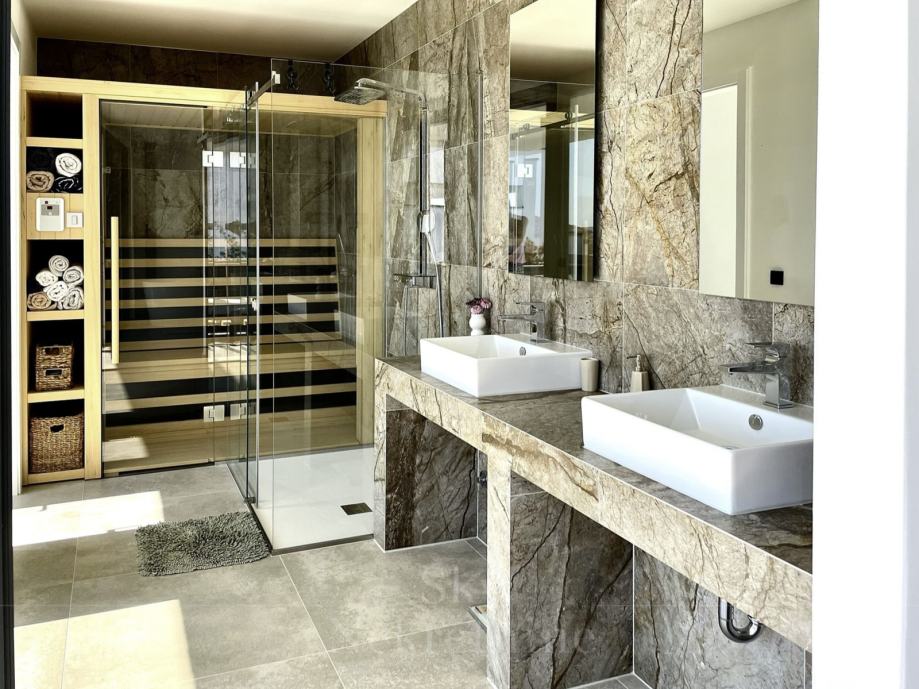 Prizemlje vile obuhvaća moderno opremljenu kuhinju s otokom, svijetlu blagovaonicu i dnevni boravak s pogledom na more i bazen. Na ovoj etaži nalaze se i dvije spavaće sobe, svaka s vlastitom kupaonicom i terasom te gostinjski toalet.