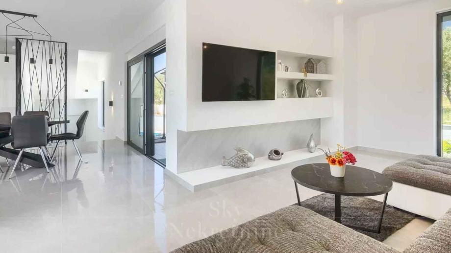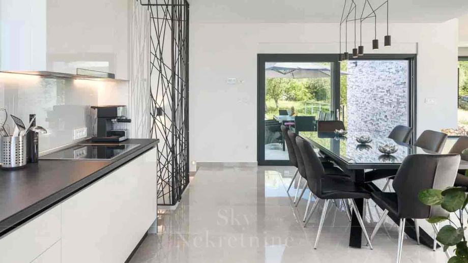 Na katu se nalazi dnevni boravak, moderno opremljena kuhinja s blagovaonicom, toalet te djelomično natkrivena terasa.