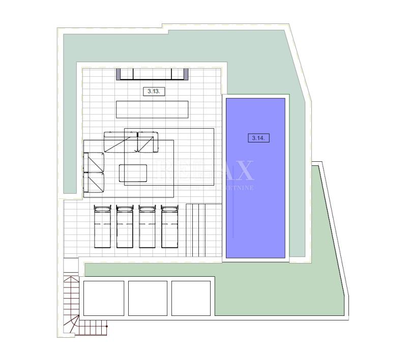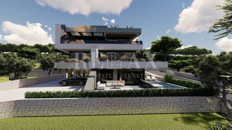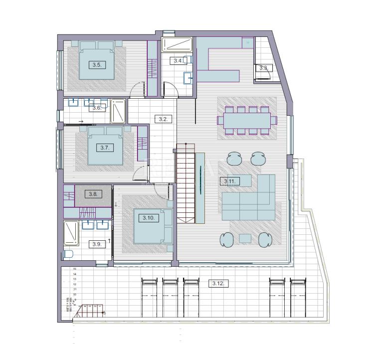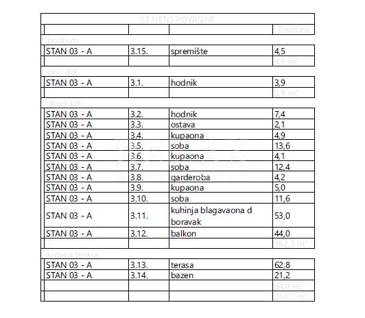Stan 166,2 m2 se nalazi na drugom katu, sastoji se od master spavaće sobe koja ima walk in ormar i vlastitu kupaonicu, hodnik, dvije spavaće sobe, dvije kupaonice, ostava, velika open space kuhinja sa blagovaonom i dnevnim boravkom sa izlazom na veliki balkon s kojeg se pruža prekrasan pogled i od kuda stepenice vode na krovnu terasu 84 m2 sa bazenom i sunčalištem, na koju je moguće dodati još neki sadržaj po želji.