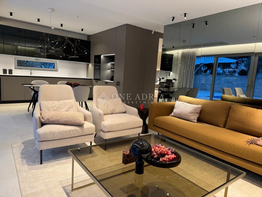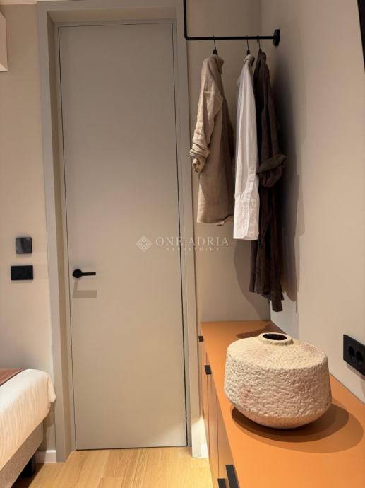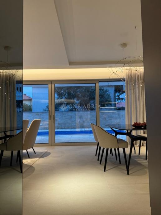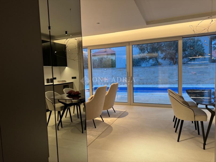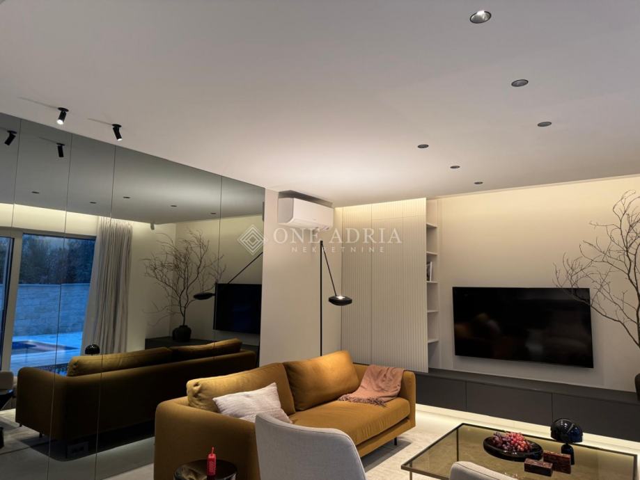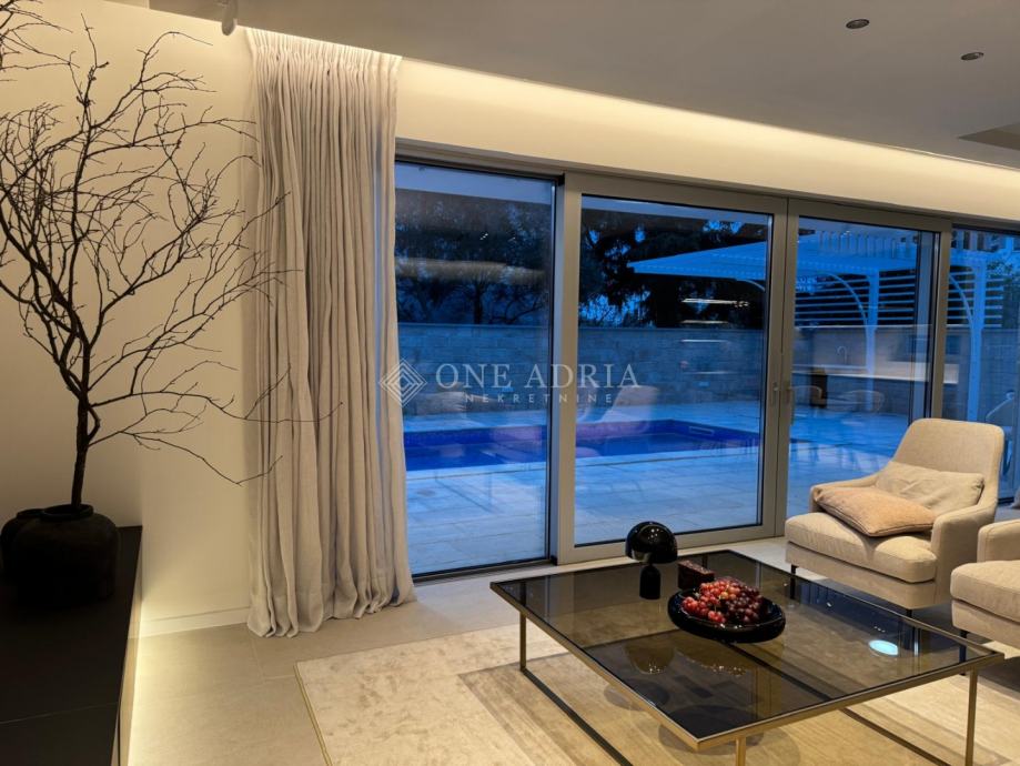 Objekt se sastoji od dvije spavaće sobe, dnevnog boravka s kuhinjom i blagovaonicom, te je okružen lijepo uređenom okućnicom s privatnim bazenom. Ova nekretnina predstavlja spoj vrhunske gradnje, modernog dizajna i atraktivne lokacije u neposrednoj blizini mora, idealna za stanovanje ili investiciju u luksuzni turistički najam.