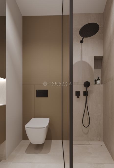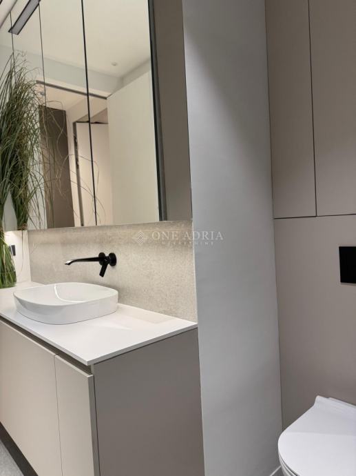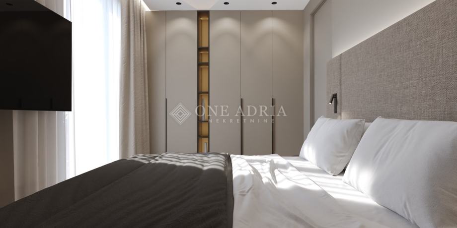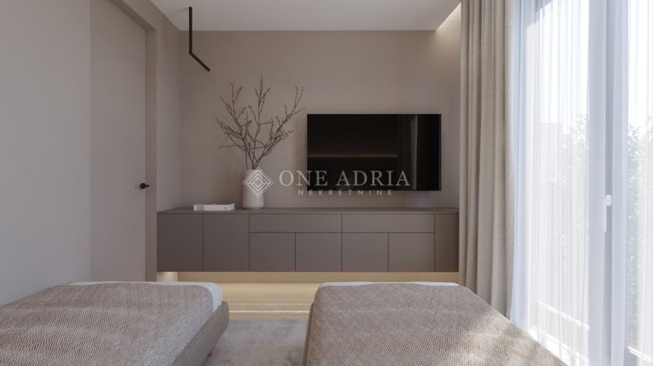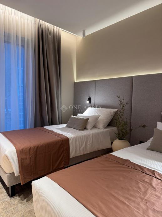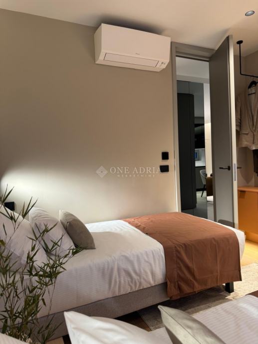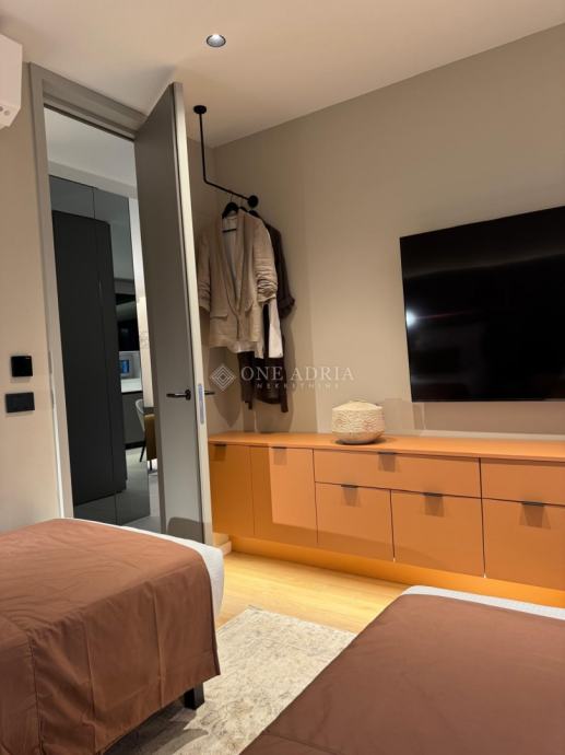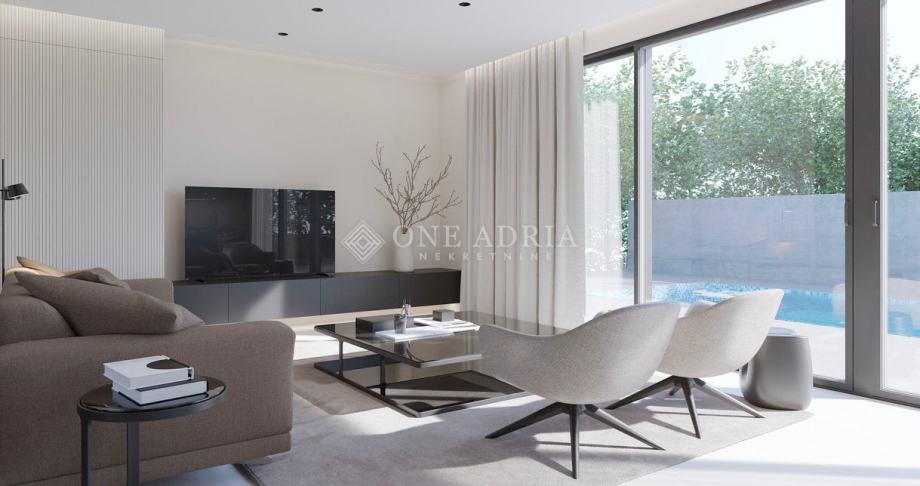 Objekt se sastoji od dvije spavaće sobe, dnevnog boravka s kuhinjom i blagovaonicom, te je okružen lijepo uređenom okućnicom s privatnim bazenom. Ova nekretnina predstavlja spoj vrhunske gradnje, modernog dizajna i atraktivne lokacije u neposrednoj blizini mora, idealna za stanovanje ili investiciju u luksuzni turistički najam.