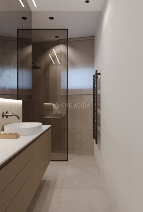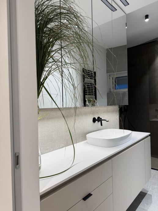 Objekt je građen od vrhunskih materijala, uključujući Wienerberger Phorotherm opeku i beton marke 400, što jamči visoku razinu stabilnosti, trajnosti i toplinske učinkovitosti. Vanjska stolarija izrađena je od aluminija renomiranog proizvođača Cortizo, s troslojnim staklima i ugrađenim komarnicima. Rolete i žaluzine upravljaju se električnim putem. Fasada je izvedena u STO sustavu debljine 15 cm, što dodatno doprinosi energetskoj učinkovitosti objekta.